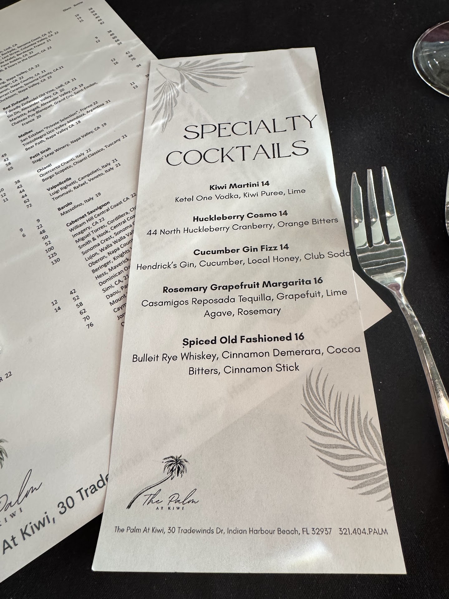 Just finished an amazing meal at a restaurant I didn’t know existed until tonight. Chef Dylan and server Joe took great care of us at The Palm at Kiwi restaurant. From start to finish, the meal and service were excellent! There were plenty of tables available in this quaint restaurant on a Saturday night. This restaurant is located in the Kiwi Racquet and Fitness Club in Indian Harbour Beach. You do not need a membership to dine in the restaurant. The indoor dining is only open on Thursdays, Fridays, and Saturdays from 5-9:30PM. You enter the Kiwi club and the restaurant is immediately on the left side. If you get to the breezeway outdoor dining area, you have gone too far. You can make reservations on the Resy app. We started off with the Caesar salad and lobster bisque. Both were beautifully played and delicious. The entrees were a 6oz filet with bearnaise sauce and a crab mac and cheese side. The second entree was a chicken parmesan. The steak was cooked perfectly and chicken parmesan was delicious! The crab mac and cheese was rich and delicious with an excellent crab flavor. The cocktails were a kiwi martini and a rosemary grapefruit margarita. Both very good! We...