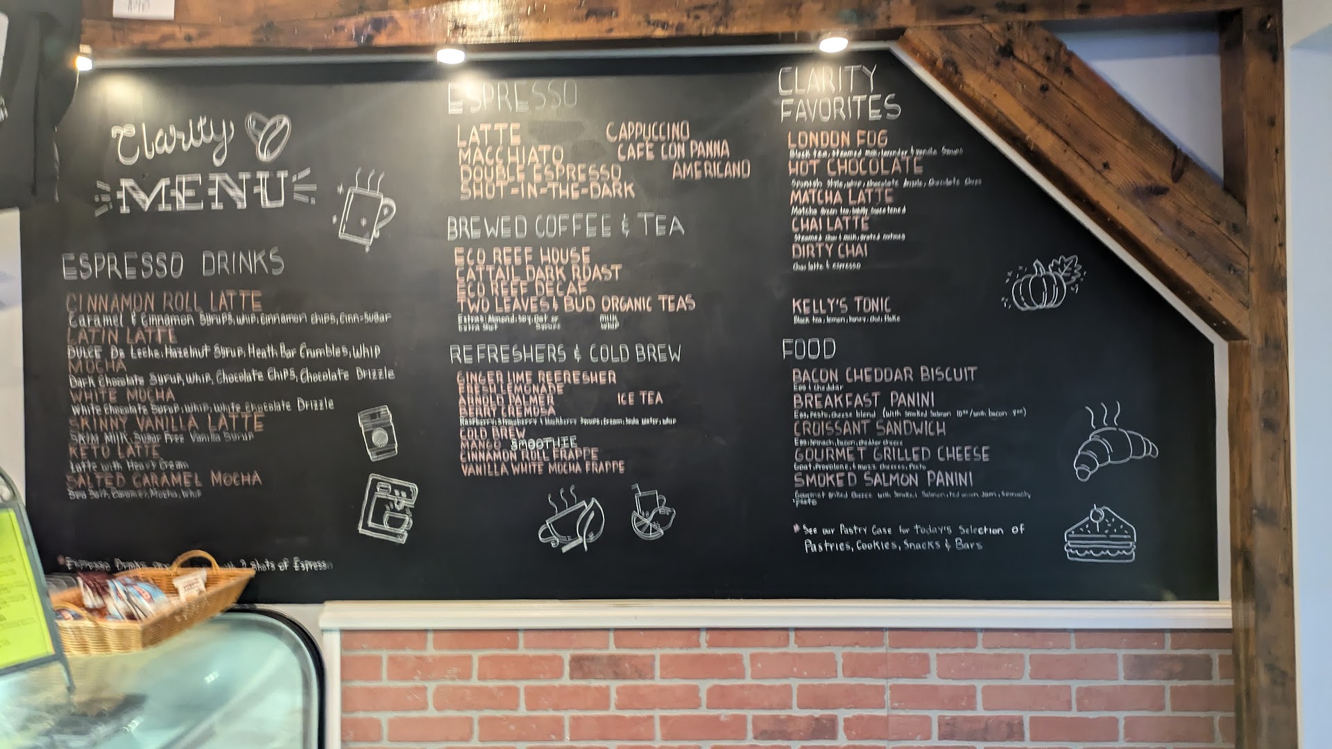 Clarity offers an array of speciality drinks; from pour over to cold brew to the classic espresso, as well as a wide variety of baked goods and a small selection of paninis and other luncheon items. Perhaps most importantly however, the quality of the coffee here is bar none, and they make a top notch espresso, at a very reasonable price. While the price of some of their other food items is a bit on the high side, the taste and quality is on point.