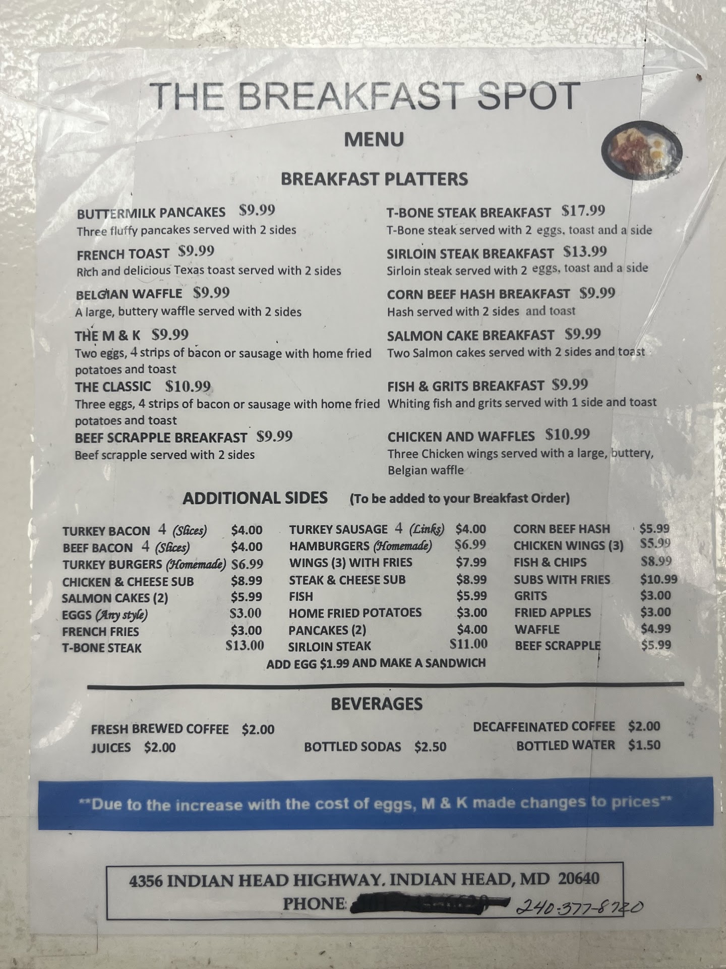 Took some time to support a new business in Indian Head, MD! The Breakfast Spot is fairly new and had quite a few items on the menu I was interested in trying. I went with the Chicken & Waffles dish w/ scrambled eggs on the side. The Belgian waffle was light and fluffy with crispy edges!!! (Extremely nice touch) chicken wings were fried a little hard but still enjoyable with the waffle. The eggs were scrambled nicely (they seem conscious of not wanting to over season food so add salt to your liking). I would like to see larger portions of juice but overall, as a new establishment I look forward to dining here again! Hereās to another successful business in...