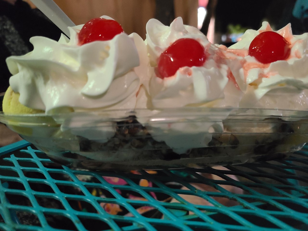 They put it in a styrofoam cup so it wouldn't melt too fast. They do have the regular banana split tub containers but it doesn't have a resealable lid so they recommended the cup which turned out perfect. I had the pleasure of speaking with the owner (she was serving the ice cream) and she was such a pleasant person to talk to while she made the ice cream for my family. Highly recommend! Note: my banana split melted just enough that a picture would have been an injustice! But my stomach was...