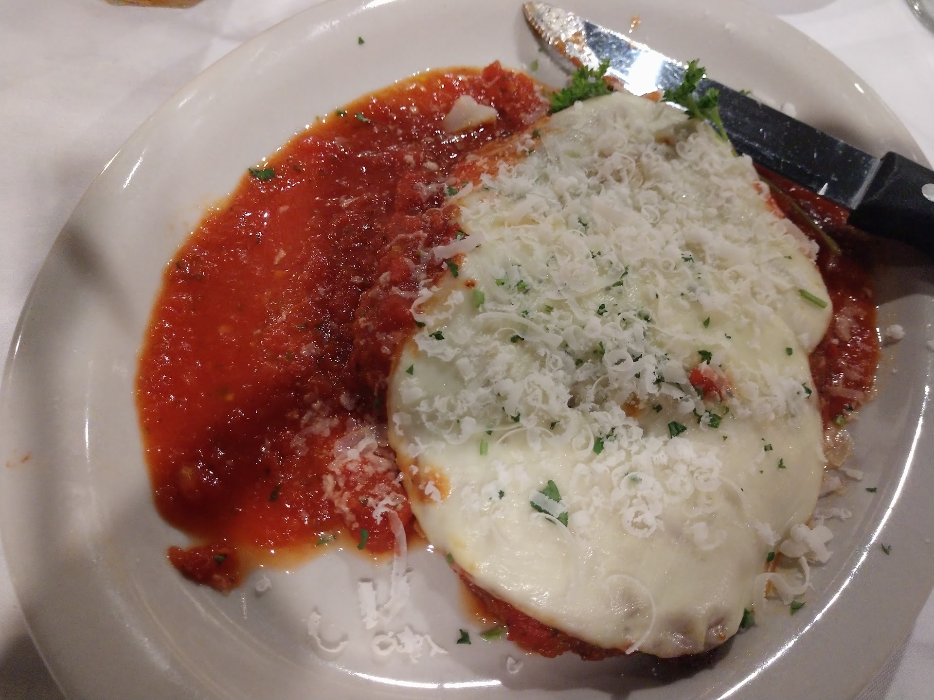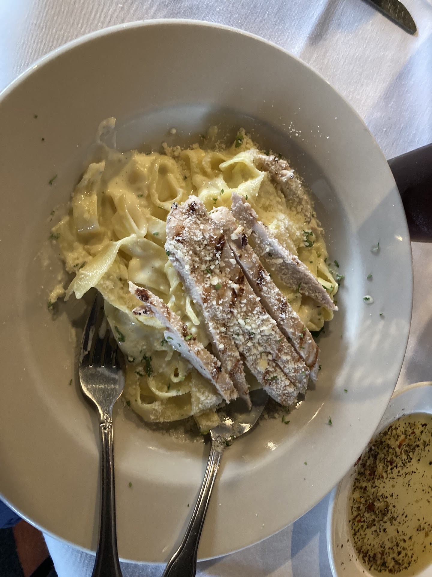 We ordered brushetta and fresh mozzarella for appetizers. Chicken parmesan for entrees. We asked for angel hair but was told they only have rigatoni due to how busy it is. In the end we got angel hair so they bent the rules for us which was preferable to me. (Thank you)