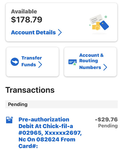 Now let me get to the cherry on top. I placed another Mobile Order for breakfast this morning (8/26) and my daughter went to pick it up. She gets through the drive thru only to be told my card was declined. Same card I always use, there is money in my account, so unsure why it's giving them issues. I pull up my banking app and there is a pre-auth for $29.76 for Chick-fil-a. I also receive text messages as soon as a transaction has taken place through my bank, which I did get one. I screenshot both and send them to my daughter to show them. I had $208.55 in my account and it was now showing $178.79. I told my daughter to park and I would call and speak with a manager. Spoke to Alaina or Elaina who was very sweet but could tell she was young. I asked to speak with a manager and she said she was the manager. She explained that the card would not go through on their end and that it will show up as a pending charge on my bank and will fall off in 3-4? business days. I told her the money is showing removed from my account but it does say pending. She said she would try to get a director, Taylor, to speak with me, who was on site. She came back to the phone and said she spoke with them and told me the same thing. Of course upper management would dodge calls because they do not want to deal with it. I am pissed, was probably not the nicest to Alaina?, but I have never had an issue with my card there, especially when there is money in my account. So I am out $29.76, with no food to show for it and hoping the transaction will fall off in a couple of days. And I should notate that IT BETTER.