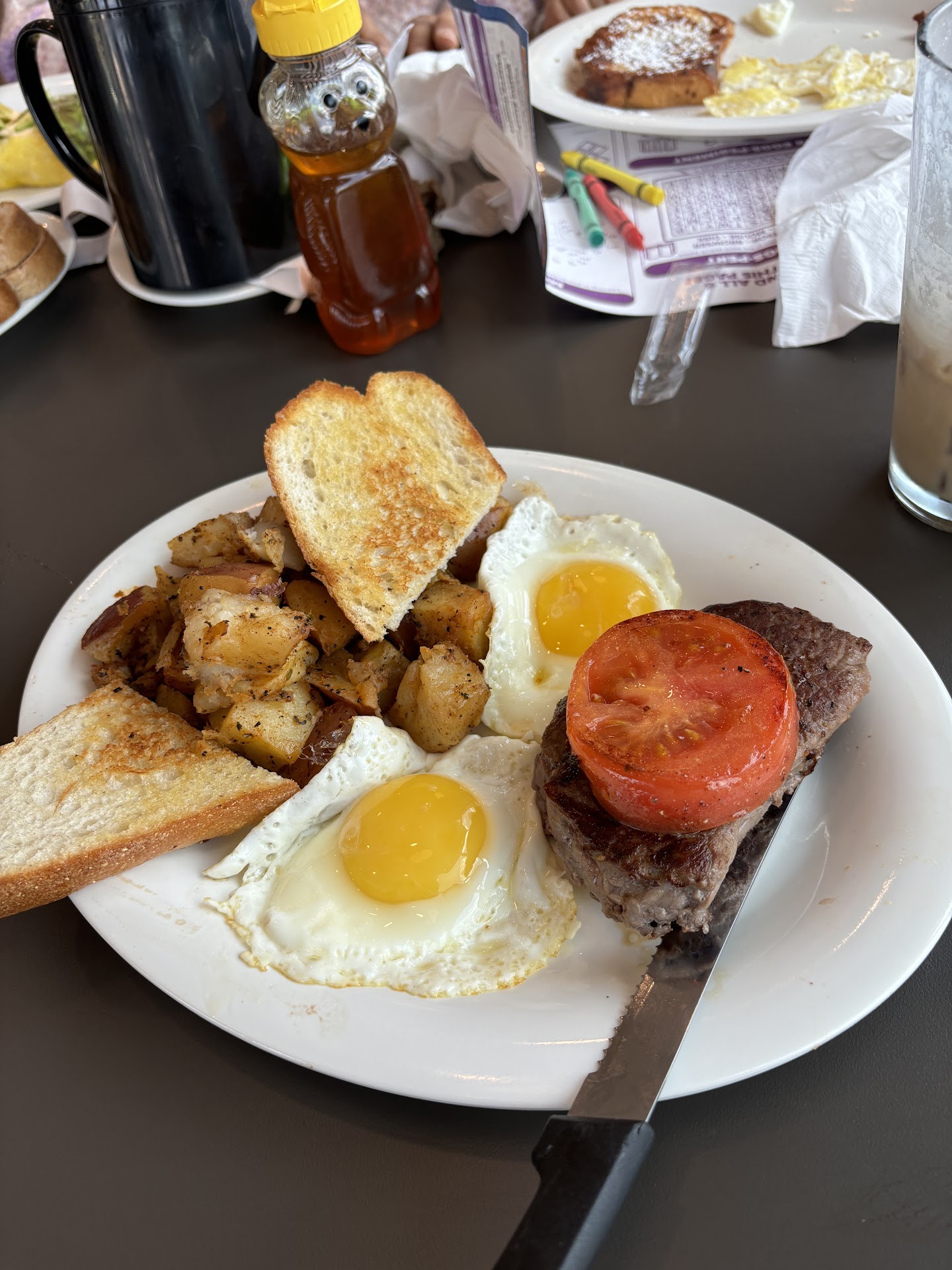 Our first visit was on a Monday, Feb 24th, I believe her name was Christa that seated us and took our order. I was impressed with her enthusiasm for the company. She knew the history and the menu extremely well. And her personality was such a pleasure. My husband and both our boys have worked in customer service and hospitality and we value great customer service. She was spot on, and the food was cooked really well. We loved the grilled biscuits, very soft and fluffy, nothing was smothered in grease. The bacon was crisp but not burnt. Eggs were fluffy and grits were creamy. The menu had lots of variety with fair prices. The decor is supper cute. Great location. Our second visit was on March 28th, a Friday. I had just come from having fasting labs and they were a little busy, we were seated right away, but about 15 minutes passed and no one even made eye contact with us, while others coming in after us were getting waited on.. My husband had to walk over to another server and ask why were were being overlooked. I'm not sure why someone did not at least stop at our table to let us know our server would be with us soon. Nobody likes to feel invisible. Our son is a server, so I know how busy it can get. But at least try to communicate. We waited a little longer and we were just about to leave when I think it was the manager who came over to our table with fresh donuts and apologized. She was so nice, and it was nice to feel heard and appreciated. Not too long after that our server came over and said she was sorry, she was in the back. The food was great, and the kind gesture of the manager saved the day. We will...