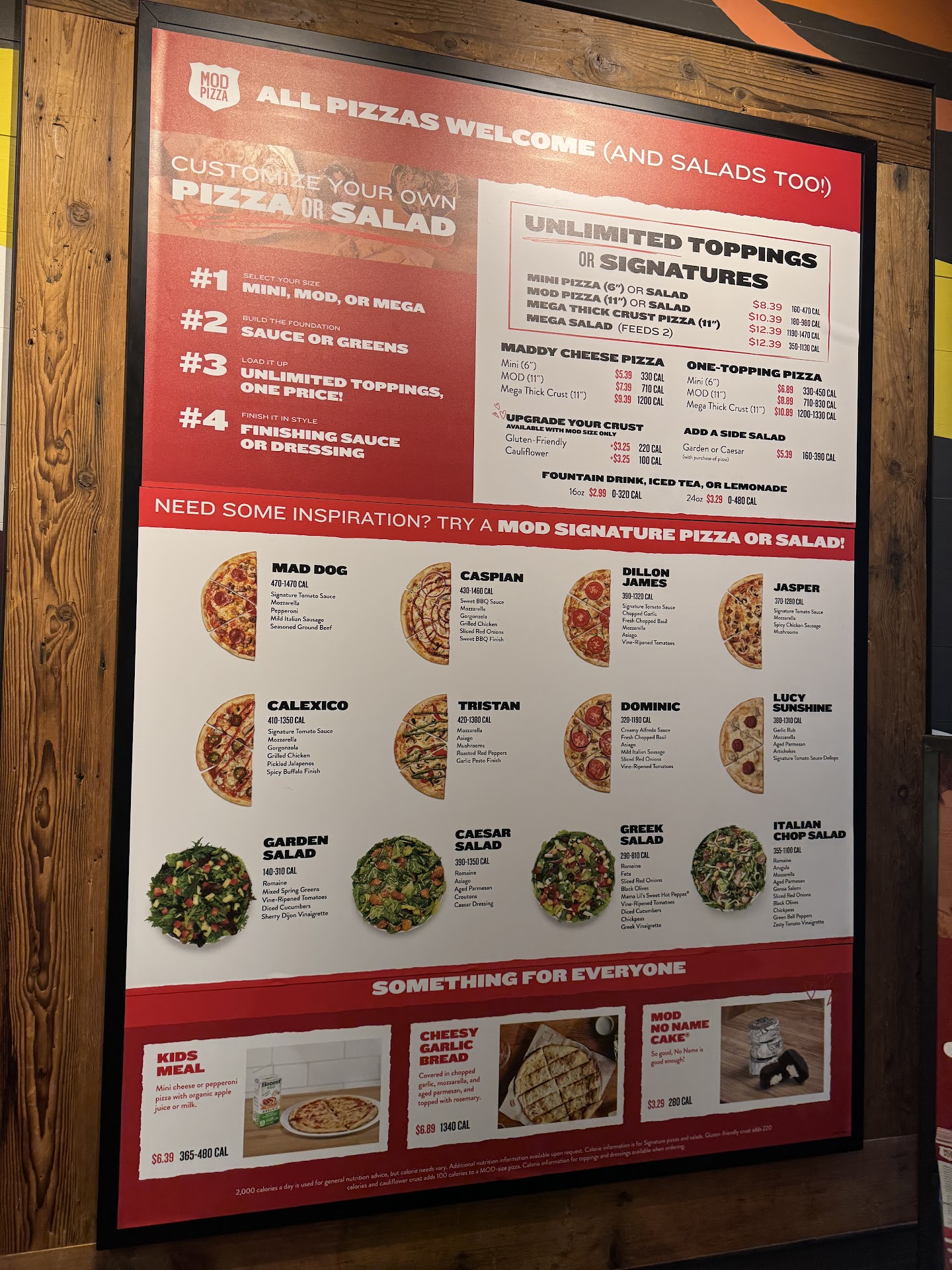 MOD Pizza is an amazing new take on the pizza experience. MOD stands for made on demand. They offer you an experience to crate your own pizza with the toppings you want on it, and the best part is that the toppings are free. Yes, free. When you enter the restaurant, it has a very hip and fresh new vibe. Like a piece of art meets downtown of a city. The food is stellar. They offer a few different pizzas that are their own specialized pies. Then, if you want to do your own thing, which I recommend, then you do a MOD 11 inch pizza. It's a personal thin crust pizza with as many topping as you wish, and they are made right in front of you. All the toppings are fresh and delicious. Toppings choices are a lot from vegetables, meats, cheeses, and even your type of sauce. They also offer desserts that are made for one person but oh so good. I also enjoy a special house dressing for on top of my pizza that is a spicy ranch that takes things up a notch. The drinks are ok. Nothing to write home about. The overall place I give a 8.5 out of 10. A definite must try if you like pizza or a nice different place with a wonderful staff. One suggestion would be to offer MOD pizza merch for fans...