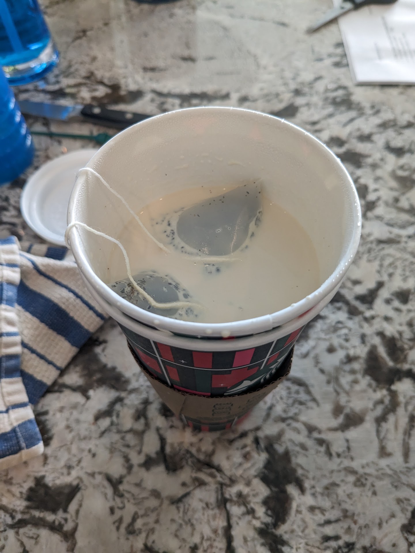 Read moreSomeone on staff needs a lesson for London Fog....."half & half" is a type of dairy...it does not mean fill the cup half with water and half with cream. Also 5 pumps of vanilla syrup.....a London Fog tastes horrible without sweetener of some sort. I stirred it up too and it didn't help so it wasn't just on the bottom. Picture shows how full it was when I got it....I know the frothed milk dies down but this seems a bit extreme....