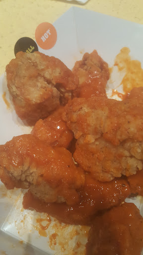 On the above time and date, my family and I visited this Buffalo Wild Wings location for an early supper. We helped ourselves to a seat, and I took this time to use the restroom. I found it in horrible condition, with urine pooled on the floor under all the urinals. The whole bathroom was quite pungent, and the sink was extremely dirty with hair in the drain and water stains covering the fixtures and mirror. Once I arrived back to the table, I found that no server had arrived to even begin our order. It took several minutes for the server to come over and take our drink order. It was at this time I noticed 3 employees standing at the front door/hostess stand, and all 3 were just talking and laughing. For the duration of my visit, those 3 servers stood there and never left their spot. When our server arrived, he brought my partner and I's food first. It was about ten minutes before he brought out the order for one of my children, and 4 minutes after that, the final order for my other child. The wings that my partner and I ordered were old and gotten quite solid, and they contained irregular and misshapen pieces, some of which were more breading than meat. My partners orange chicken sauce had an odd plastic taste to it, she refused to finish them and I dont blame her. The server also forgot to bring us silverware and kept placing items in the table within reach of our 11 month old. The server also was extremely quiet, offered no read-back of the order, and was not paying attention when a refill of drink was necessary. He honestly seemed like he wasn't interested is providing a service to us. The mac-and-cheese was extremely runny and the noodles didn't taste fully cooked. At some point in time, another server approached to let us know our original server went home, but we were already done with this dining experience so I simply asked for my check. In the meantime, I overheard extremely loud profanity from the kitchen and witnessed two employees apparently kissing with dollar bills between their faces right in the middle of the dining area. Even their takeout boxes have adopted the employees work ethic, as it fell apart as soon as it was placed in the car.