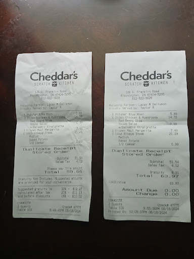 Read moreWe were very excited to eat at our first cheddars scratch kitchen. Every time we visit the Midwest or south we purpose to get here but this was our first opportunity. I wanted to enjoy a nice meal that was made from scratch. Unfortunately our experience was negative. Not only did our waitress get our meal wrong after discussing and describing our options and how things were made. We were really looking forward to what she described we were going to get. After our meal arrived we realized she ordered the wrong meal from the cook. The chicken strips were fresh and very good, but our fries were reheated in the microwave and tasted like cardboard. The waitress brought the rest of our meal out after we had eaten, at a later time and offered to give us fresh french fries in which we denied. One of the things that was also disappointing was⊠we were immediately thrown back by the political statements and lifestyle approval buttons and stickers on our waitresses apron. We came to cheddars to enjoy a nice meal the cheddars way, we wanted and expected professionalism and a quality meal. Instead we were forced to tip the person we donât politically agree with nor do we agree with the lifestyle they were promoting. But thatâs not why we came to eat, we were hungry, we wanted a quality meal. I was offended, I did not come to promote a political agenda or a persons lifestyle. Now as we approached the finish line to pay our tab and give a tip to the waitress I was forced to make a judgment, do I promote the quality of food I was served and am I forced to give a good tip to somebody I politically disagree with? I shouldnât be put in that situation. That should not be something that I have to think about when I go out to eat with my wife. I came to eat a quality meal and left sad and offended. We will never be back or...