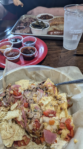 So I had only visited a City Barbeque once years ago. I had a friend drive into town for a funeral and he wanted to meet afterwards. He chose here. I think the first overall issue I noticed was they were understaffed, which is common about any place these days. If they were staff properly, then management needs to rethink their staffing. A very kind young man was at the register and my card locked the system up. He had to get assistance a few times from the other young man that was prepping all the food for pickup. We moved to the other register which was not open so he could complete my transaction. By this time, I believe there were probably 7 orders behind me lined up to the door. I chose a back booth in the corner because we had a service dog with us, and I actually had to wipe the table and the booth seats off. My food came up, but we never heard my friend's name called. His name is Steve but they had his name as Stan, so we really weren't listening for a Stan to be called. He got quite an assortment and was happy with everything, especially the collard greens. I tried a few of the meats and they were good as well. I had the PitMaster Nachos. The cheese on the nachos looked like, had the consistency of and sort of tasted like gravy. I wanted more BBQ sauce on them, so I went to the self-serve station and the container was empty of small plastic cups. I took it up front and had them put a few more in so I as well as other customers could get some barbecue sauce. I will stress the service wasn't bad and the two young men at the front counter I believe were trying their best. I spend a lot of time in the service industry, and I believe they are being robbed of a good customer service training experience. The rest of the experience was...mehhhh, at best. So now I've been to the City Barbeque not too far from my house. I won't be going back anytime soon, and for the sake of the employees and other customers, I hope they make some changes. I simply won't be the one experiencing them. I will say one bonus was I downloaded the app before I went just to see if there were any rewards for joining. It does give you a $5 coupon off, so at least I didn't pay a lot for my meal. I got my nachos and a water for under 5 bucks. Be sure to download that...