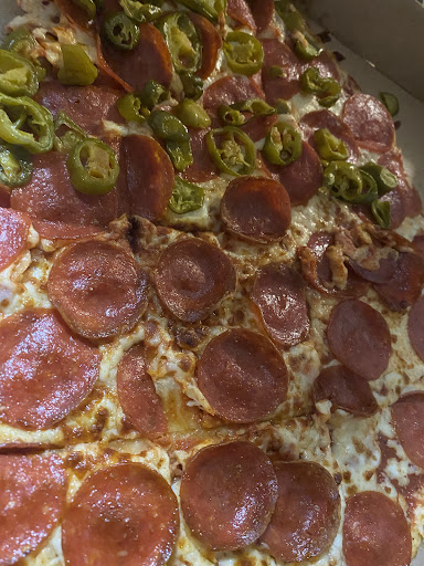 Pepperoni on every bite , jalapeños every bite on half, cheese perfectly thick . Crust crispy with a beautiful undercarriage..