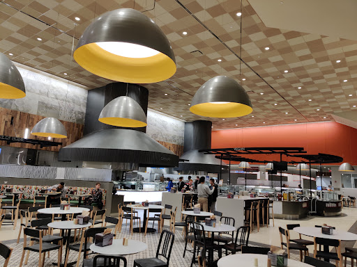 Pros: your friend group can always find a seat, food is always available, lots of options. Cons: long lines, cold eggs for hours, one trash receptacle area that fills...