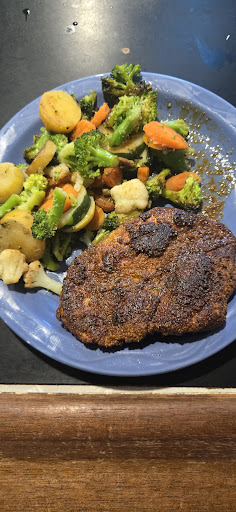 Well, here is his version and was just as good. Just a warning, it's got a lot of heat so just letting you. Know before you order it. Blackened Chicken with veggies on the side. Fantastic.