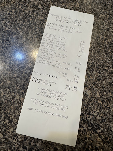 Read moreWe were told upon arrival that there was a wait of 15-20 minutes, so we decided to wait along with 2 couples and 1 group of 3 people that were ahead of us. In that 15-20 minutes we counted 5 groups walk out after eating. 25 minutes later, the 3 groups that were ahead of us were finally seated. 43 minutes total later, we were finally seated by 2 giggling little girls who couldn't figure out where to seat us in the 30 tables they had open. We walked past 6 empty 2 seat booths and 3 larger booths. These tables were not just cleaned as if they were just used by previous customers. The restaurant was not busy at all; you could almost hear a pin drop bc it was so quiet. No one was seated at the bar and the bar tender leaning against the bar doing absolutely nothing except wipe down a bar that had not been used. There were also 2 other waitresses hanging around the kitchen chatting up a storm, again, bc they were not busy at all. 10 minutes after being seated our waitress finally comes and gets drink order. 8 minutes later we were finally brought our water. Within that time a waitress was on a break, I assume, bc you couldn't realy tell who was on the clock or not bc they were all doing the same thing. Nothing. She put in her food order, after we sat down, with the same waitress and by the time we got our water, she had her food. After an hour of being told there was only a 15-20 minute wait we left with only getting water. She never came back to get our order. This place was the worst tumbleweed experience we've ever had. We will...