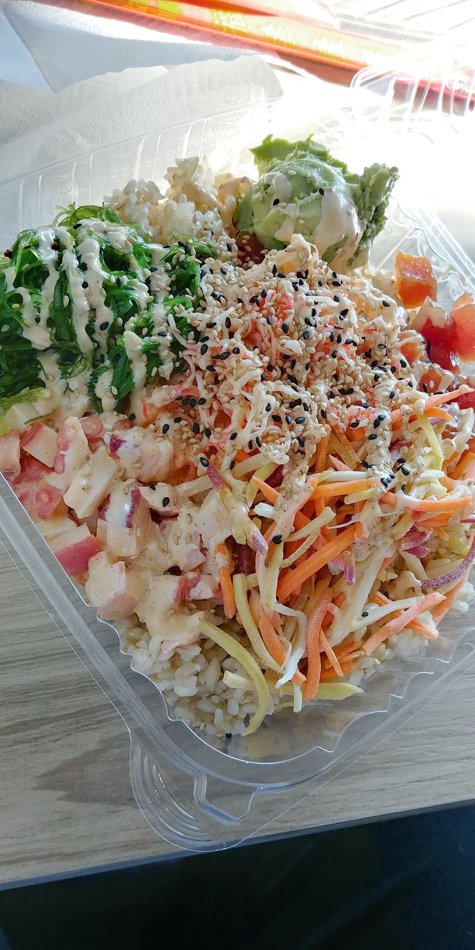 FOOD REVIEW: Absolutely delicious! A great selection of addons (free!) to put into your bowl. The marinated (and raw) tuna and salmon were fantastic. The coloration of the raw fish is great, and there didnt seem to be any bad smell to it. There are also cooked options (shrimp, octopus, tofu?) if you don't like raw food.The vegetables are fresh and brightly colored. The method of obtaining your food is similar to subway. You ask for your base (rice, etc.), your protein, then any extra addons you want. Even the shredded crab is an addon!