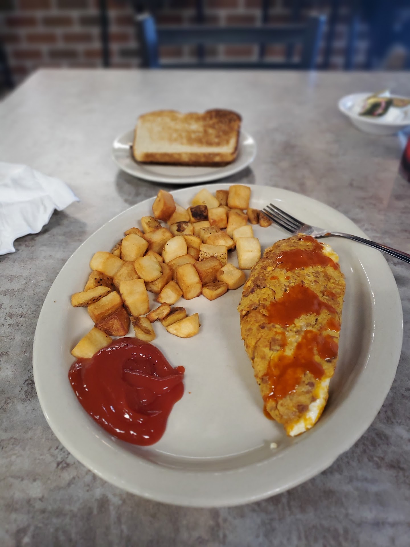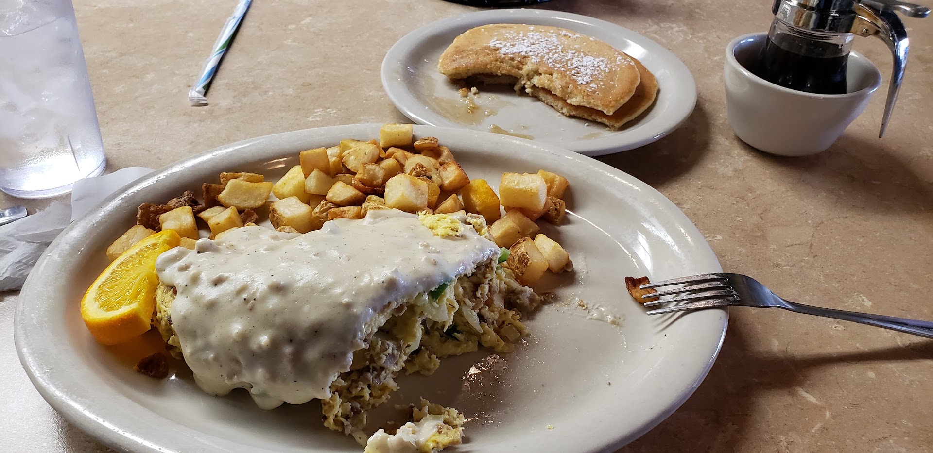 To start off, the outside of the building is a certain niche aesthetic. They have some decor to brighten the atmosphere and it does well but the dullness of the general strip is quite tainting to it but of course they can’t help that so ya can’t hold it against them. Walking in it was quite dead compared to the last time I was there, about 2 years ago. The air seemed stale and cold, it previously was filled with life and texture nonetheless I was greeted with enthusiasm by one of the servers telling me grab a seat wherever I’d like and she’ll be there shortly. I was with my grandpa and he’s a very old fashioned man so he went ahead and told the server to get coffee as we were walking.(I personally see this as rude but he does things like this all the time so I’ve gotten use to the awkward feelings.) The server, again with great enthusiasm went straight for it, looked at me and said “just one?” And I raised my fingers to say 2 and she immediately started to set up 2 coffees. I noticed that the creamers were already present on the table, with various flavors as well and i definitely enjoyed that and found it to be a nice addition to the experience. They also featured butter, sweetener, salt and pepper at the table. The server gave us coffees and menus and said she’ll be back to take our order. I’m a vegetarian and to be honest a quite frugal vegetarian so I stuck with coffee but my grandfather got the biskets and gravy with over medium eggs on top and the server informed us with excitement that is called a “dicky”. I always enjoy when workers take pride in the menu! My grandfather tried to convince me to get something in which the sever joined but didn’t push. So I appreciate a server who is social but not forcefully! I had hazelnut creamer and Splenda with my coffee, while I was on the second cup I noticed there was table sugar there which in my opinion is better than sweetener so I started using that. Onto the decor, the pairings they had up were very abstract and eye catching they seemed to be painting by amateur or local artists but upon asking I found they were done by the owners! Quite an interesting artistic approach! The furniture wasn’t too bad either. The color scheme of the entire restaurant was mainly brown it had a very 80’s vibe but the other side of the 80’s. I could imagine a scene from “fear and loathing in Las Vegas” taking place here. The chairs are a classic black frame with brown cushion, tables are black from With brown top. The booths are 3 different shades of brown but honestly quite comfortable, very good lumbar support that makes taking notes for this review quite easy! The booth table tops are a cobblestone grey with is a neat contrast to the rest of the aesthetic. My server Marcy was very kind and good at her job as well! The final bill was only 14.65 so it was a decent experience. My grandfather almost started a scene towards the end of our visit but I managed to keep him under wraps which was sorta...