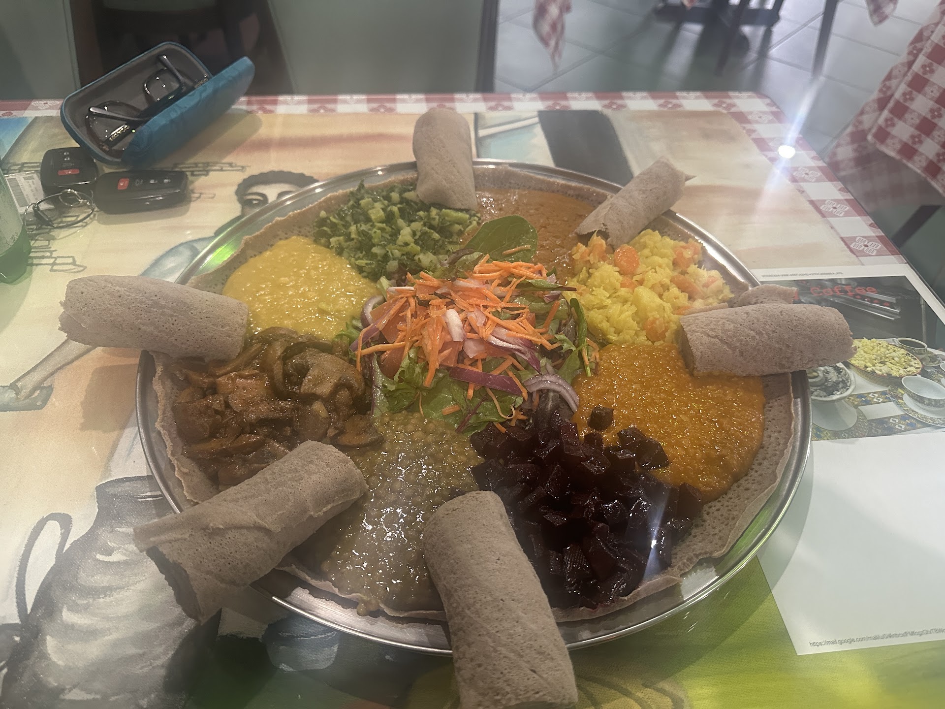Read moreSo grateful to have this relatively new restaurant, in my neighborhood! Excellent service by a waiter, Ephraim, spacious and serene surroundings, and the menu offerings are, simply put, on a level of gourmet cuisine. I ordered a combination plate, with two kinds of meat dishes, one chicken and one beef, and three vegetarian dishes, green and yellow lentil and collard green. The combination also came to the table with their vegetarian cabbage dish, which I had been reluctant to order, for some reason, but it ended up being my favorite. If you've not tried Ethiopian Injera (from Wikipedia: a sourdough-risen flatbread with a unique, slightly spongy texture, used to scoop up meat and vegetable stews) it should be on your "bucket list". I've been to a few Ethiopian restaurants, including another here in Indianapolis, and one in NYC, and...you just...