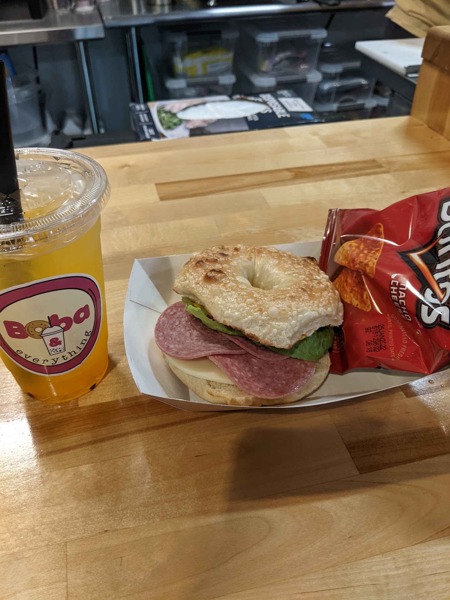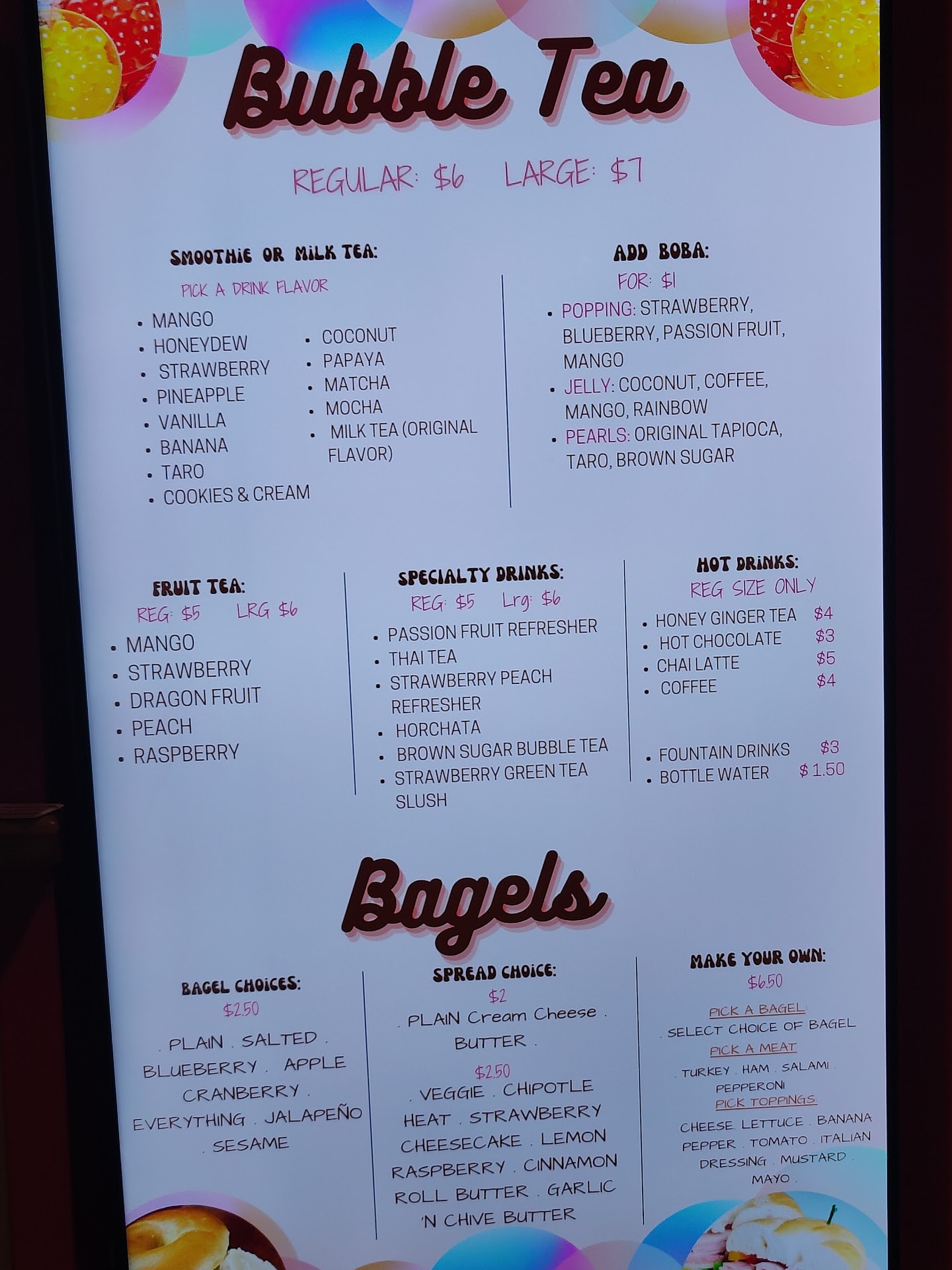 I got the brown sugar bubble tea with brown sugar boba and the flavor was delicious! I, like other reviews, noticed a difference in texture from the normal boba texture though. I have similar boba at home and I think it might be a matter of not cooking it long enough? Not sure. Other than that, the bagels are warm and have a great crunchy exterior with a soft warm interior. I got a simple turkey sandwich with garlic butter. The garlic butter is to die for! I did wish that my sandwich was all warm instead of just the bagel though. Also it would be awesome if you guys could create set sandwich options for quick, easy ordering for those of us that have a hard time “building our own”. I want to know what you guys find delicious! I also would recommend more savory cream cheese options. Like spinach/ artichoke or similar. Overall, thanks ladies for a great experience and I can’t wait to come back and see the business...