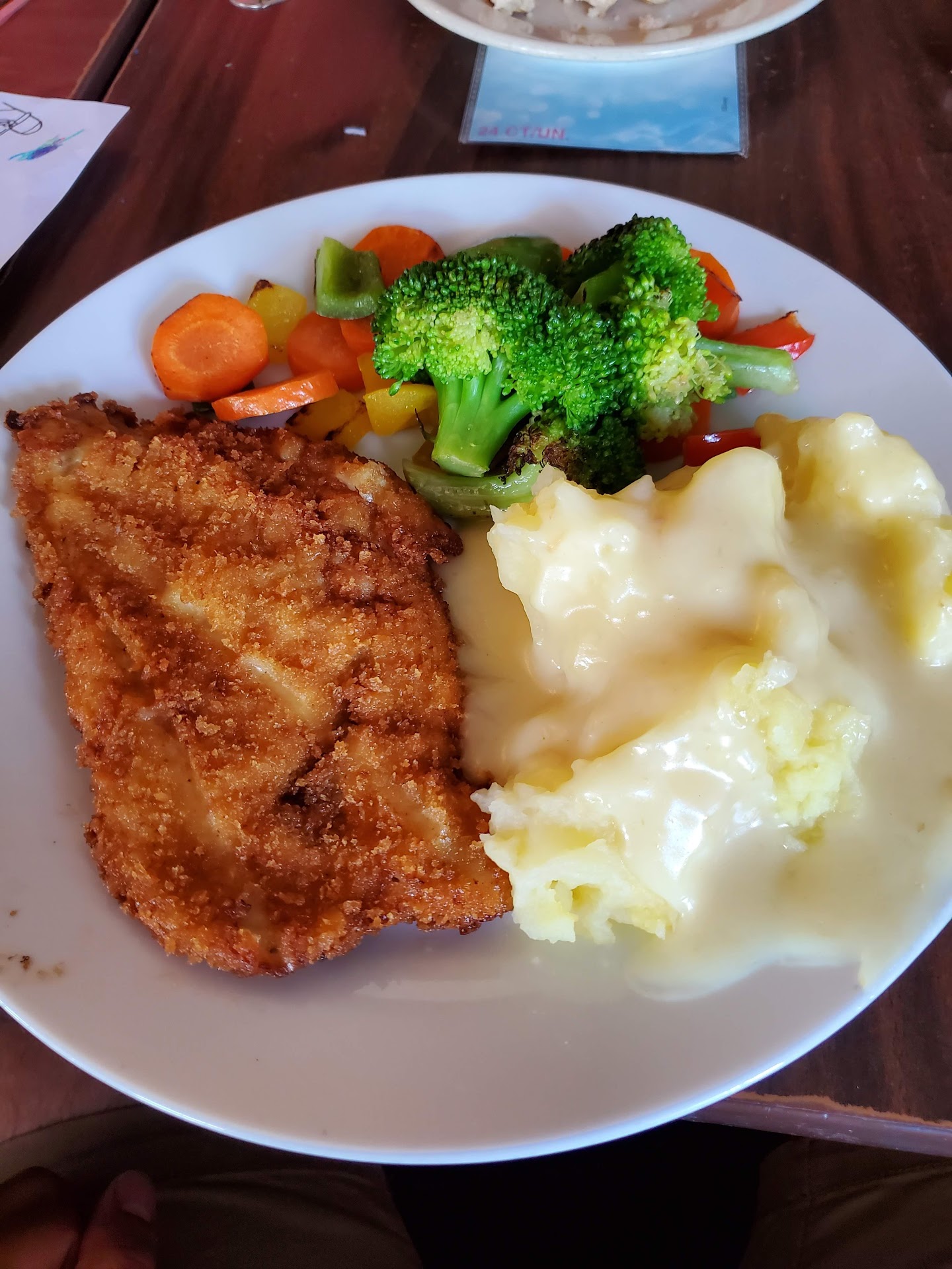The chicken breasts in both the Manhattan and sandwich were cold and dry, as if they had been sitting in a window waiting for 20 minutes. Good thing we had that water. The sides, cole slaw, Brewpub fires, and shoestring onion rings, were fine. Cold like the chicken but edible.