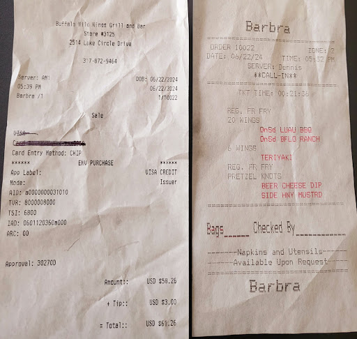 Read more12/30/20 Update- I have USPS Informed delivery & there is an envelope from BWW today 12/29/2020 Update-Got a call from the kitchen manager on Dec 14th, we discussed our visit/my review and hubby's review. He apologized & asked if he could send us some gift cards. I said sure, he verified our address & as of today, Dec 29th haven't received anything from them. Don't say you're going to do something if you're not going to follow through.... I would like to add to my husbands review. First, the poor bartender was slammed and no one gave her much help. 1 guy came over to the bar and helped her serve a couple drinks, then another guy (may have been a manager?) served drinks to 1 table then just wandered back and forth for the rest of the time we were there. BOGO wings is a busy busy night, they should have more than 1 person in the bar area serving, or at least have a backup plan for someone to help! Now for the food, not only were the tots cold but so were the wings. When we were finally able to get the servers attention to let her know some of the wings were sauced wrong, she did correct it and we got nice, hot wings, to replace the wrong ones, about 20 mins later. We were offered Ranch or Blue Cheese, but no mention made of celery and carrots, and no ketchup was offered for the (cold) tots. We did not say anything about the cold food because she didn't stop long enough for us to comment and didn't want to wait another 30-40 mins for them to redo our order. Now on to the ladies bathroom. Walked in to paper towel all over the floor and a server in the handicap stall, sounded like she used 2 rolls of toilet paper during her bathroom visit, all I could hear was her constantly pulling paper off the roll! I washed my hands and went to dry, no towels and the electric dryer was not working. On our way out the door, we decided that we would be taking a...