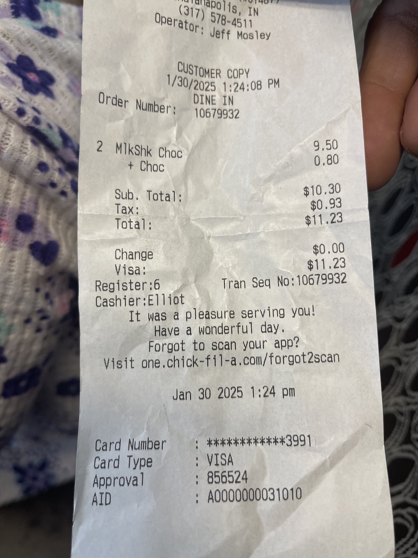 Read moreI was just at this location this evening for dinner with my parents and it was wonderful as usual! We all got our food just as we had ordered it and all loved it. Once we found a booth (close to the same one my dad and I usually get for daddy/daughter lunches hahaha) and sat down our food came out almost right away. It was hot and tasty as always. I had the #2 combo spicy chicken sandwich with waffle fries and a Cherry coke and both of my parents had chicken strip combos, but my dad had a fruit cup instead of fries. We all loooved our meals and gobbled them down like there was no tomorrow! Oh, and also, I found out they have ice cream! I have never paid attention to the dessert menu so didn't realize it. But Dad wondered out loud what they had for dessert and asked if my mom and I wanted anything. We assumed he was craving dessert but he came back with cones for us and...NOTHING for himself! I guess he just wanted to show us up. That ice cream was creamy and so flavorful, and huge! I didn't have a problem eating it though! The service was great as usual, but I did notice the table felt a little sticky on my side. Nothing that will keep me from coming back though. As we were leaving a young man who had been sitting at a booth across the aisle saw us head toward the door and got up to open it for us. I think he might have been a server on break, but either way I appreciated the welcoming feeling we got. Chick-fil-A has always impressed me and I look forward to...