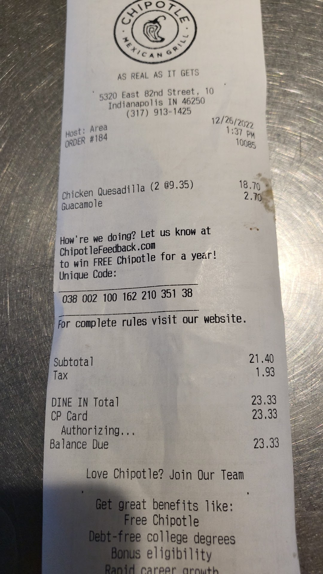 Ā Ā Ā Read moreI specifically called the restaurant before my order was confirmed and asked the MANAGER if my food came with chips and if NOT Iād be moreee than happy to go ahead and pay for some chips and he stopped me and gladly said heāll put some in the bag for me and I would not need to pay. Thanked him a lot and got off phone⦠well I didnāt have chips when my order arrived. I call the restaurant very upset (Bc Iām pregnant and I wouldāve just paid for the chips I said I would pay for and Iām literally craving them) Iām trying to ask to speak to the guy I just spoke with and the lady HAILEY would not allow me to. I asked to speak with THE MANAGER (because she did state she was NOT the manager) and she said no and to call 1800Chipotle and said they were completely out of chips. Which was weird Bc I had JUST placed my order and my dasher picked my food up fairly quick after it was placed! Itās 10:01 currently and I ordered my food at 9:07pm, it arrived at 9:45 which is pretty fast for this order. I donāt understand why I didnāt receive my chips and why Hailey wouldnāt allow me to speak to a manager. Iām very frustrated and will NOT EVER order from here again. ON TOP OF ALL OF THIS. As soon as I grabbed my food and my pressed apple juice out the bag my lid to my food just slid off.. the worst packaging ever. . I called my dasher (which I had his number because he needed a little assistance getting here) and asked was my food touch and he sounded so sincere to had not touched my food.. Iām confident the people at the restaurant were very lazy and didnāt package it with care and were just rushing to just close up the store which lead to them forgetting my chips! Again. I will NOT be ordering from this...