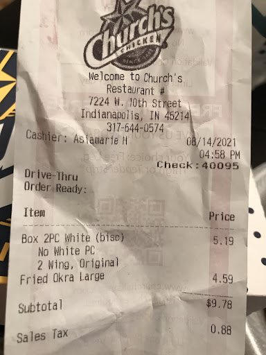 I Could Have Had a V8: My dinner from Church’s Chicken at 7224 W 10th Street was disgraceful and nauseating. After waiting in drive thru for 45 minutes, I left with the best and freshest chicken I’ve Ever received from this location. However, the fried okra I ordered fried hard was dark, so I assumed it was fresh. What a joke. The okra was stale, it wasn’t crispy nor hot, it smelled and tasted horrible. The drive thru line is now longer than before. The lobby door is conveniently locked. I called the phone number on the receipt. After one ring a computer generated voice says, “goodbye” and then hangs up. I would like every a full refund and an apology for this ridiculous unsavory meal.