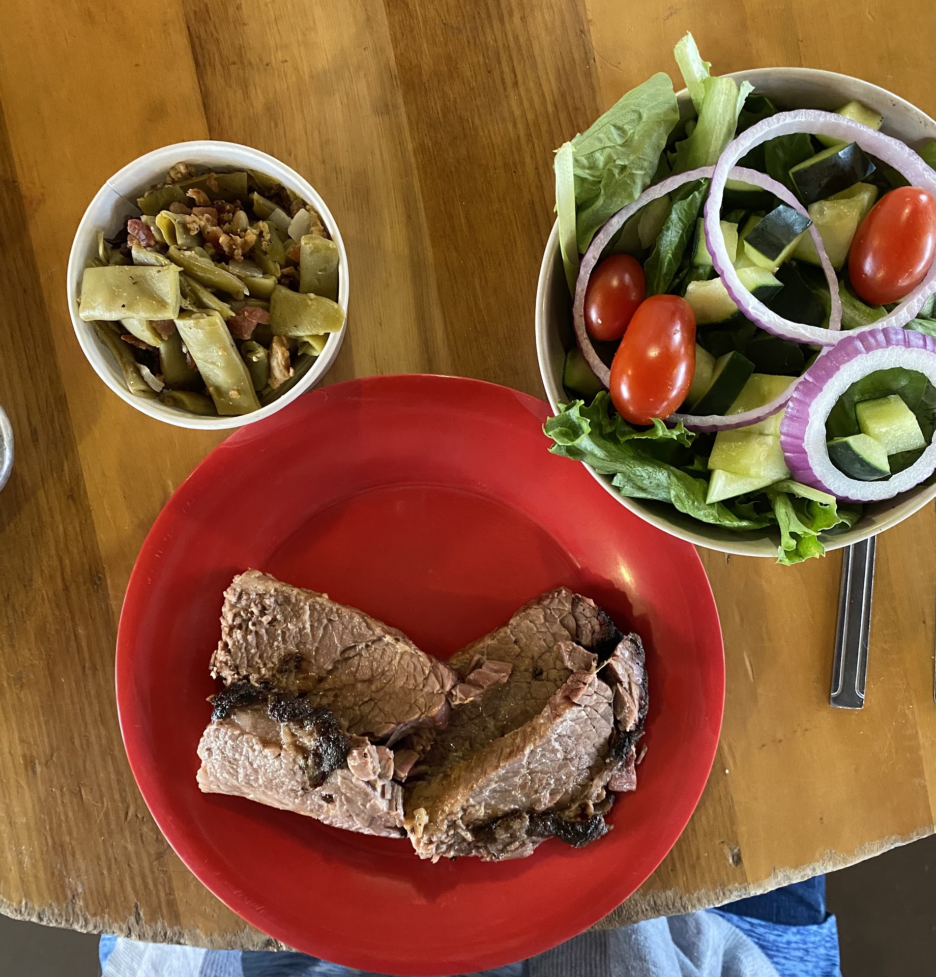 We went in with family. Everyone got a two meat option with two sides. I had double brisket shown in the photo. There is a $3 up charge for the brisket in this combo and since I had both meats as brisket I had two $3 upcharges. This was not explained nor, unfortunately, did we notice this until we were headed home (we were paying attention to family). I got green beans with bacon and a side salad with my combo. The brisket was tender but a small portion for the price. My husband also got the double brisket with baked beans and creamy coleslaw. I thought my sides were good and the side salad was good sized. My husband said his sides were average.