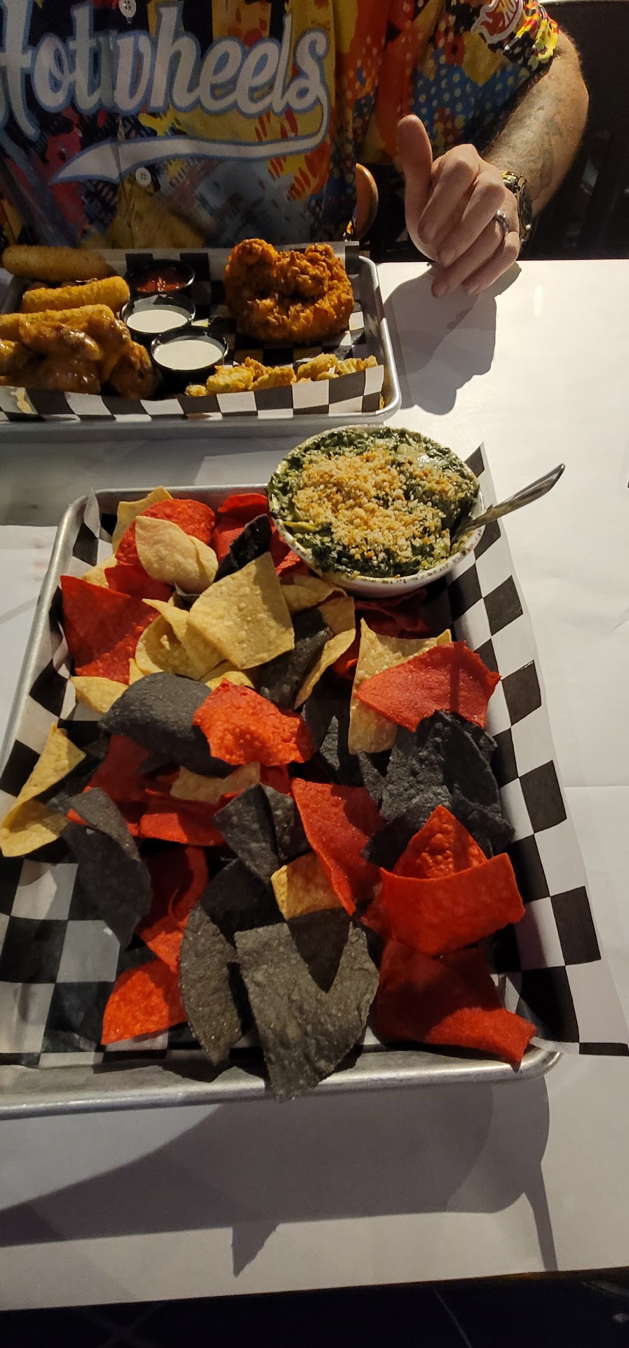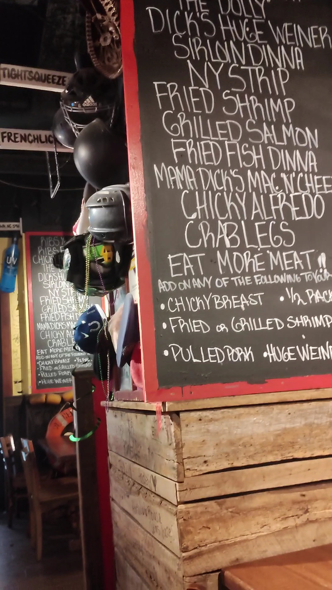 Absolutely loved the atmosphere this is not for the faint of heart. N Got a giant Margarita and I got a glass of wine. This was a 45 oz fun bowl called the big D*** super Margarita which they said to go big or go home. We got the d***'s sampler plataWhich was chicken tenders and dipped in Buffalo sauce fried pickle chips which were delightful we got garlic parmesan Buffalo wings. And. And then cheese sticks. Then we had to try the spinach kale artichoke dip with fresh tortilla chips. He got the country fried steak smothered in jalapeno gravy with country green beans and Southern style corn. I got the seasoned grilled bone in pork chops and I got them with the Southern style green beans and the loaded redskin mashed potatoes. I was extremely impressed with the pork chops with the grill marks that were on them they were perfectly seasoned they were perfectly seasoned usually I'm heads to tint on ordering pork chops because they're dry but these were extremely juicy and well done. The décor is over the top this is definitely one restaurant that you do not want to go to if you do not have a sense of humor and if you are easily offended do not come here.
