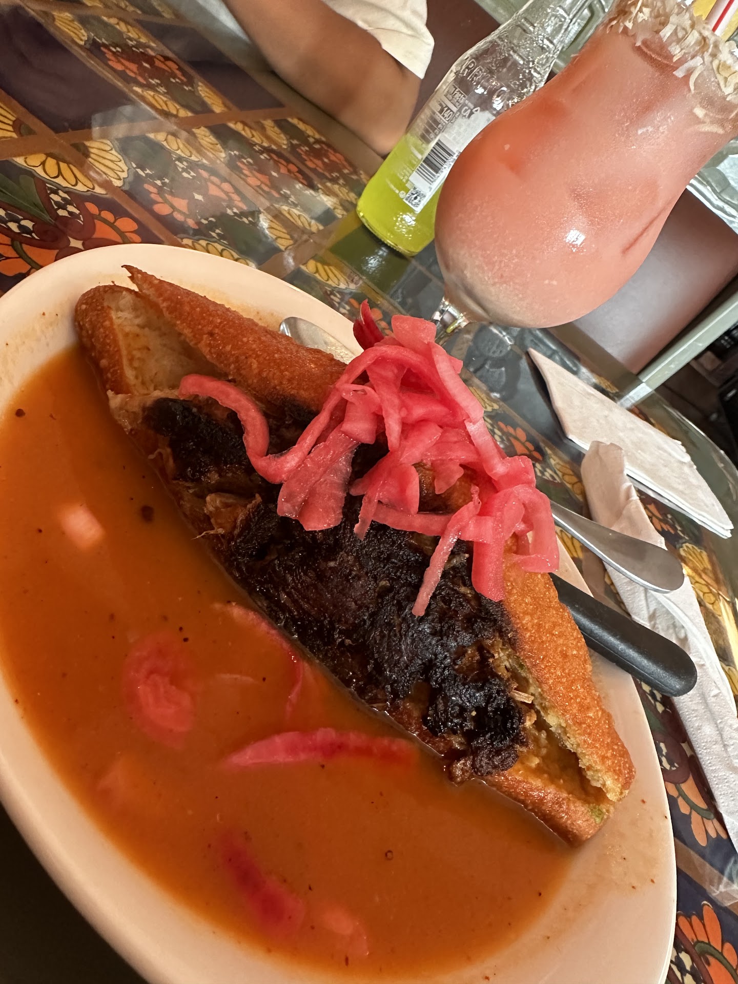 Came this afternoon 8/11 with my two kids .. my oldest order a quesadilla - pretty simple came cut in 3 pieces and a scoop of rice - A kid took my order first - so order a horchata, jarrito and I order a coconut and sangria (that was good) then a lady with a rush attitude asked if we were ready - I ask my son to started and while he was looking for what he wanted the lady for the second time asked if we were ready - so I started ordering - from the menu my youngest got an order of sopes (they stated in the menu that are made there) and I got a torta ahogada - “spicy” The drinks were brought by the lady again and told me that they were working on mine (alcoholic) she asked if we needed it appetizers which we declined cause my kids don’t like cheese or guacamole- and I knew I wasn’t going to eat them by myself - when they brought the order the sopes I was telling my son .. the menu said they were made here and you can def tell these are the ones you buy and just fry - at that time this lady came and brought my torta ahogada and prob heard my comment - after that I was ignored for the rest of the time there - I could see the ppl from the kitchen whispering and looking at me - the torta was ok - even tho you can tell my meat was kind of burn - and I didn’t like the fact the sauce was in my plate - it was not bad but I had eat better ones - Also, didn’t like the fact they have chunks of meat and queso instead of shredded meat and grated cheese for the sopes - I was not offered napkins and I even tho I wanted to try the churros - I ended up leaving and not ordering anymore as they brought me the check and we just ended up paying and leaving. Def not a good experience- Sometimes as Hispanics these type of restaurants are just for the American people as they really have know idea of our food but don’t take care of their own ppl. I did love...