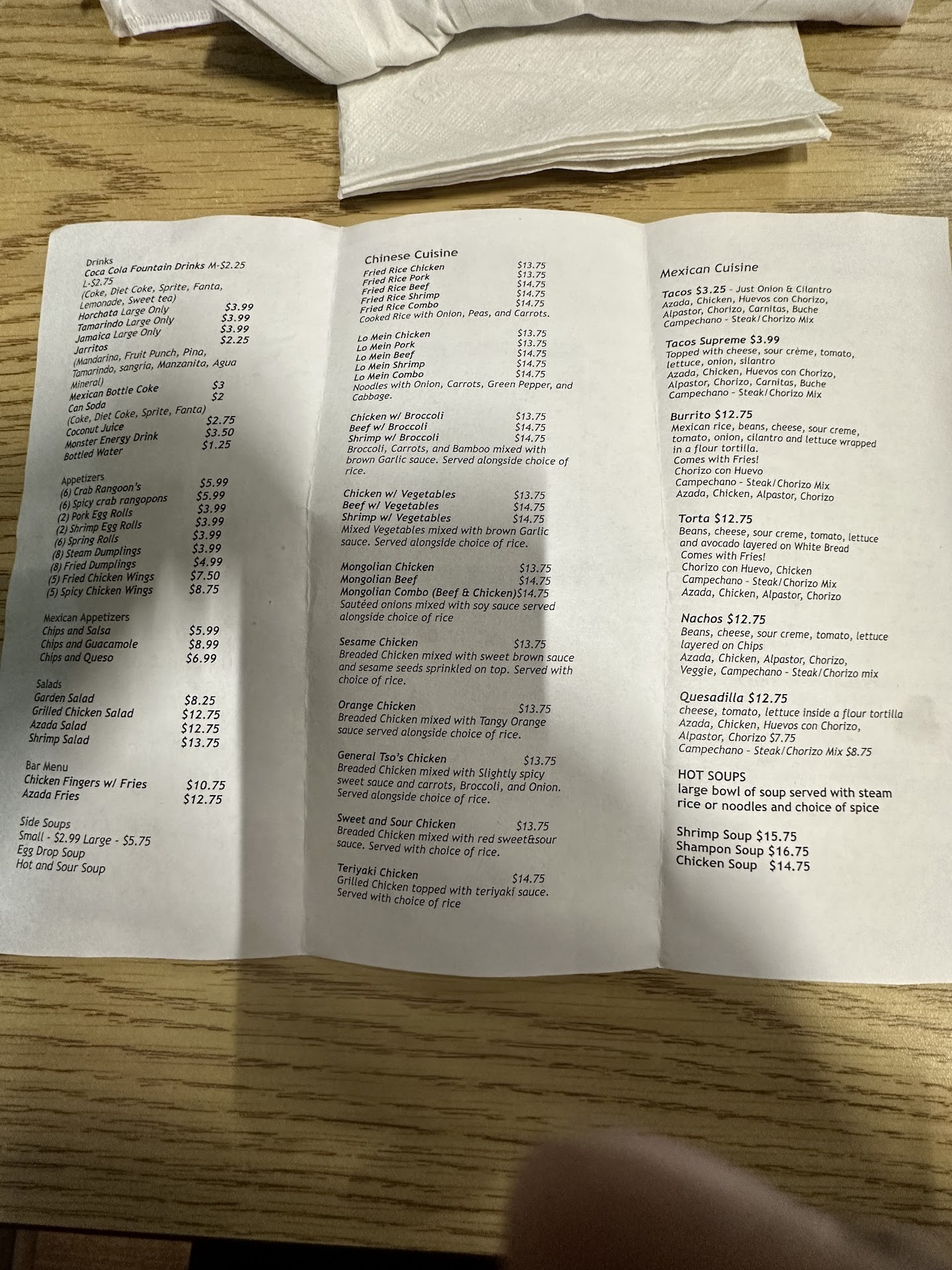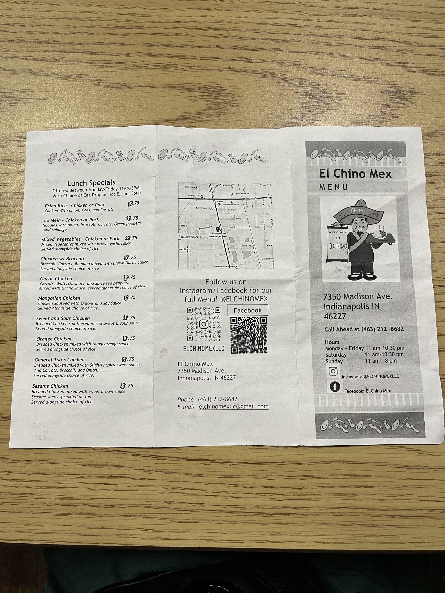 El Chino Mex, place appears closed from the outside. Upon entering, there's a lingering smell of old grease. After we seated ourselves, the staff took several minutes to attend to us and bring our drinks, but they were very courteous and friendly. There was a Chinese menu displayed on the wall, and another menu on the table featuring both Mexican and Chinese dishes. They had a section for lunch specials, though not many photos were provided. The food took a while to arrive.