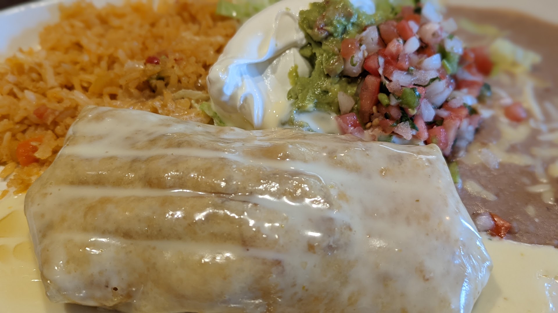 Flour tortilla filled with shrimp, deep fried to a golden brown and topper with cheese sauce. Served with lettuce, pico de gallo, sour cream, rice and beans.