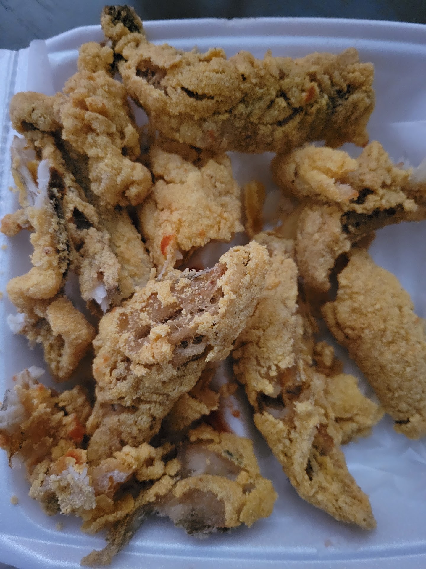 The best part was that there wasn't a long for an online order. It didn't seem busy so I can't say for sure if this is the norm. Ordered the 3 piece and the 5 piece fried chicken dinner. The where hot but seemed old. We got no seasoning because we had heard they were known to over season the food. It was a mistake. The chicken portions were good but however you look at it non seasoned fried chicken is bla. Honestly this place was our second choice. We only ordered from here because they were out of chicken at the place that we usually would go. And this place was on the way to were we were headed. We were pleasantly surprised that some grocery goods were being sold on the shelves and inside the coolers. Had we not gone grocery shopping earlier in the week, we would have taken advantage of this even though the prices were slightly higher than you would find at that...