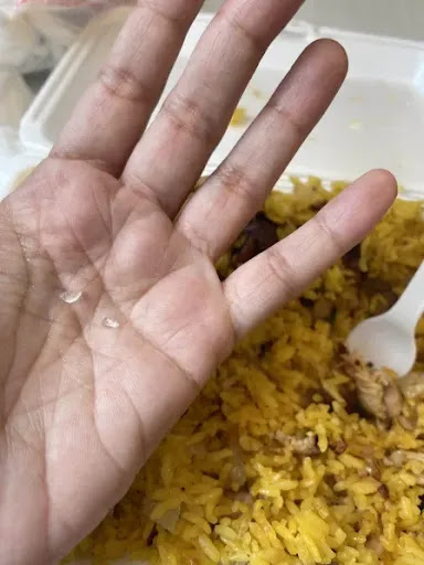 I bought fried rice from this establishment for lunch and when I took a bite I had bitten on something hard. I took the food out of my mouth and noticed tiny shards of glass in the food. I had already taken and swallowed a couple of bites of my food before noticing this.