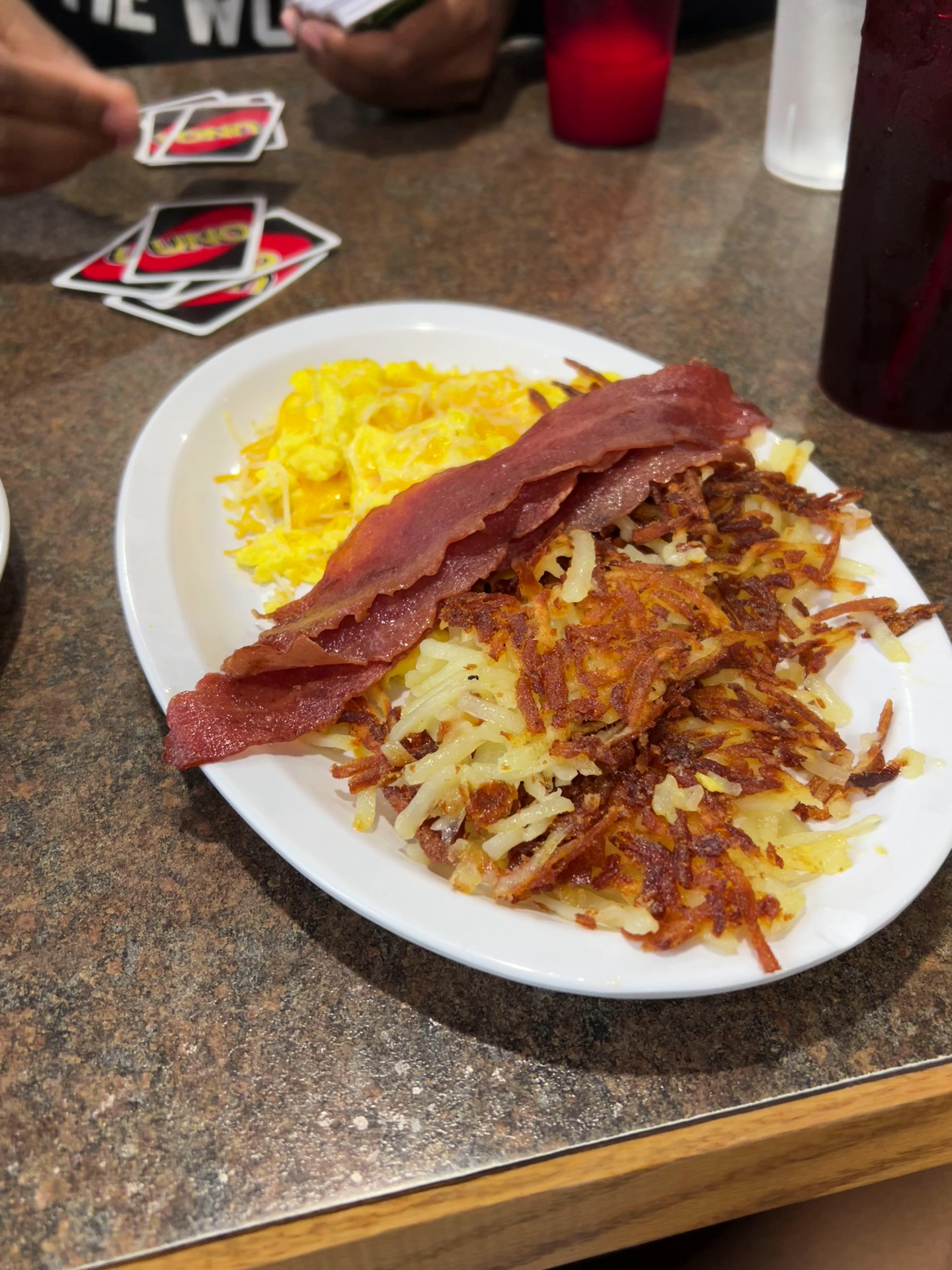 I ordered the two eggs your way, scrambled with cheddar cheese, along with turkey bacon, grits, hash browns fried hard, and strawberry pancakes. The eggs were perfectly cooked and the addition of cheddar cheese added a nice flavor. The turkey bacon was a bit undercooked for my liking, but still tasty. The grits were creamy and flavorful, better when sugar was added, while the hash browns were crispy and satisfying. The strawberry pancakes were a delightful sweet treat that I thoroughly enjoyed. The house scrambler with original pancakes, which was equally delicious.