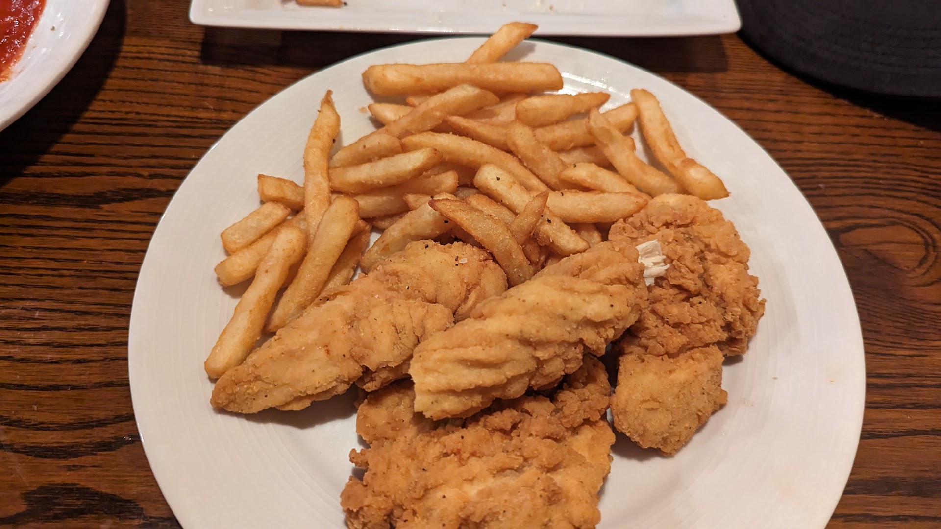 I eat my food, and it tasted pretty good actually. The bar fries are fantastic, and the chicken is crunchy and well cooked.