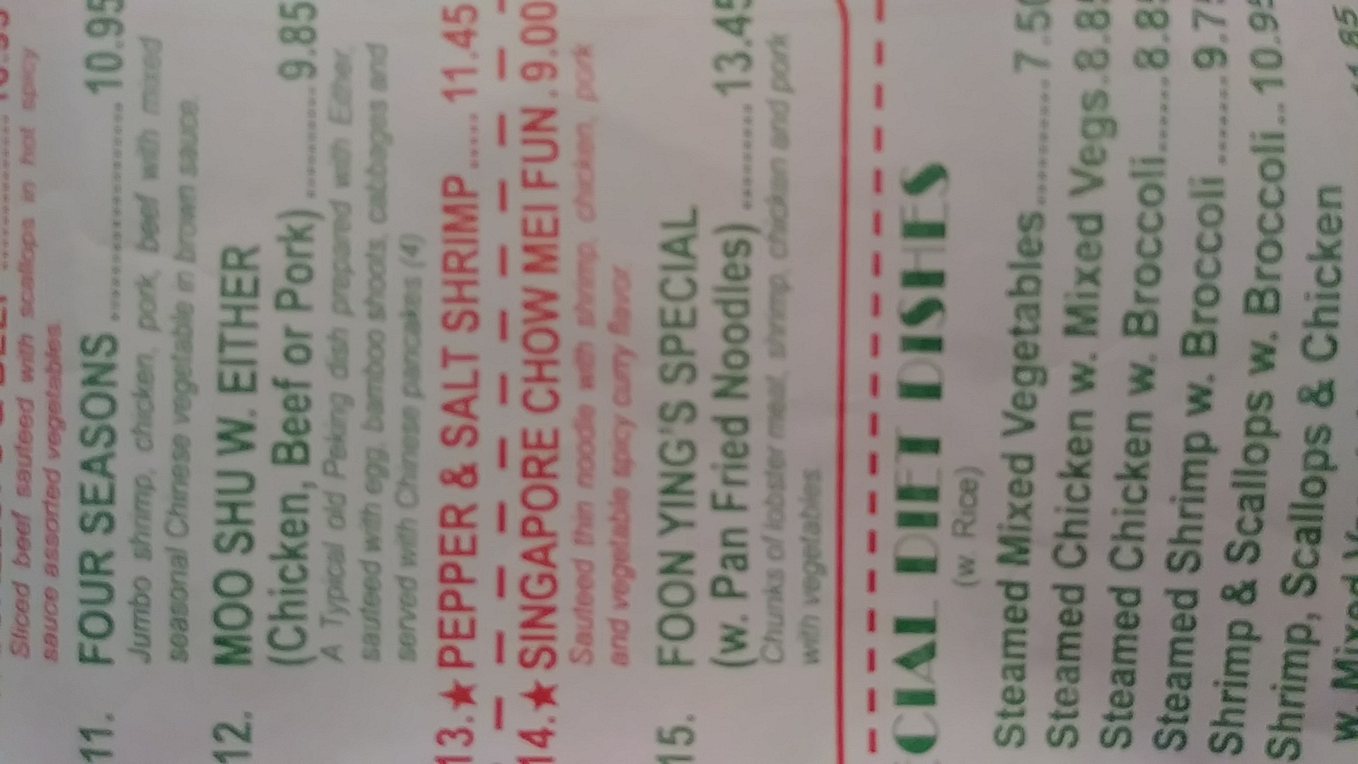 We had Singapore Cho Mei Fun which was good albeit a bit heavy on the curry but still edible. This is one of a few places that even carry this dish so I will remember to ask them to go light on the curry next time. But I would order again. Also, shrimp and vegetable egg rolls which are the best egg rolls I've ever had. Steamed Dumplings were a first from Foon Ying for us and they didn't disappoint! They were delicious. The garlic sauce they come with was a great pairing with the dumplings. General Tso's was good and well sauced. Shrimp fried rice was made to our specs (wife cant eat egg or onions so we omit the vegetables and egg) and was also good.