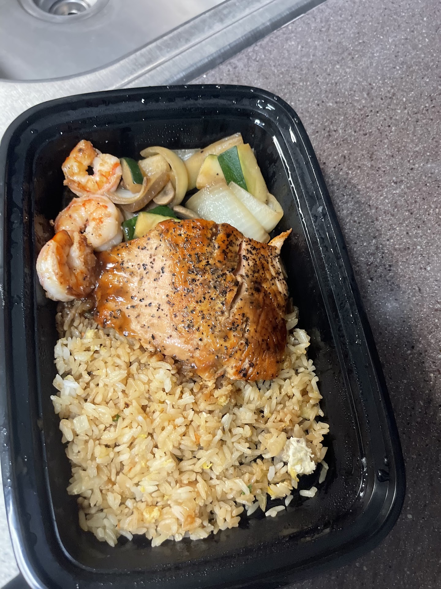 The hot Green tea came with a pitcher where I was immediately able to refill my cup which I like to do. The house salad was simple but the ginger dressing was very good with only a hint of ginger which I prefer it stronger myself. Shah asked us what we thought about the dressing and said it was just freshly made which made me assume thy may be tweaking it based on responses. Even if not I love my waitress asking about my food because it makes me feel like they care about our experience and take pride in their hard work. The Sweet & Sour soup (house soup) was very flavorful I noticed while the mushroom was dancing on my pallet it was a perfect blend and balanced. Next was the main course of steamed white rice, Hibachi mixed vegetables (onions, zucchini, and mushrooms), bean sprouts, nine grilled medium sized shrimp and Teriyaki chicken. If you want to try this for yourself order the "Geisha Special" which are traditionally Japanese entertainers known for their skills in the art. In this context I interpete it as culinary art. The vegetables were great and the rice and sprouts were as one would expect.