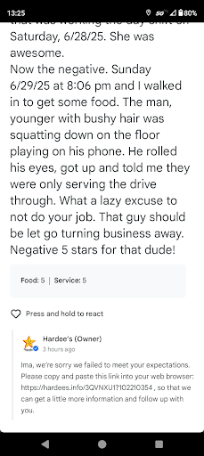 I'm so sorry that I didn't write down the name of this lady that received and managed our order. If I had, I'd warn you about who it was so that you could just walk out and go to the Waffle House next door for a fast and friendly meal, or keep driving to another Hardee's that doesn't make the entire...