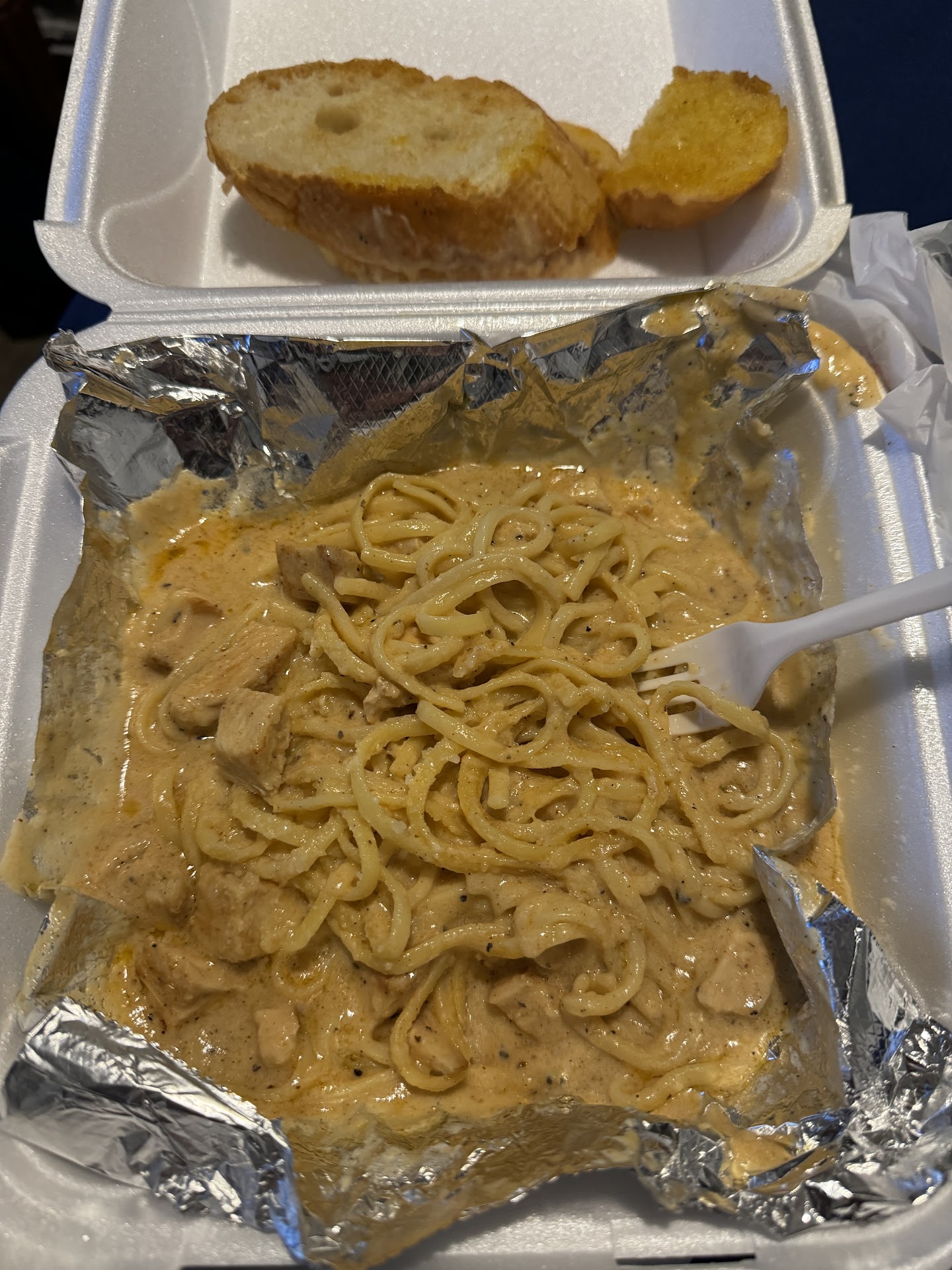 🤦♀️The cashier, Mi Favorite Luv 🫂 greeted me with Mi favorite fettuccine alfredo with heavy Alfredo sauce, ( Indy All nite ) mushrooms, are so oo ONE-Of- A Kind also, added a Xtra Garlic toast 🤝🏼