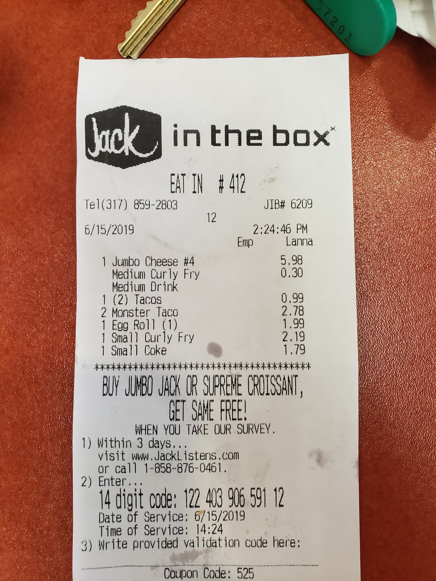 Read moreIf I could rate this location any lower I would. I never ate at this place before so I thought I would try it out. After waiting for about 5 min with not one employee offering to help I spoke up like hello. Still no reaction so a lot louder I holler can I get some help plz. One employee looked at me and about a min later another come to help. They took the order. Gave me a number and said they would bring it out. Went to fill the drink cup and almost all of the drinks weren't available. They then call out the number for me to come pick up the food. I was confused. I get handed a number and get told they would bring it out so when I went to the counter I asked why was I told you would bring it out and didnt. I then got scolded by the employee her hand went up in the air and she got loud.🤬 She was telling me how all the employees in the back were stressed out and she was just trying to keep everyone happy. 🤯 I knew it was a lost cause to say anything else. 😟 Before i left the counter i told her that there was an egg roll missing. She said oh yes there is and that shed bring it out in a minute 😳 Before I received my missing egg roll she took another guest their food. ( There were a total of 3 couples in the restaurant) she then brings the egg roll. Really the only thing that was worth eating 🌯 my boyfriend goes up to the counter to let them know that we are also missing 2 tacos. The lady argues with him and says you got your two tacos🌮🌮 he said but we ordered 4. She said no you did. He proved to her by showing her the receipt. Needless to say dont ever go to this Jack in the Box restaurant on US31 in Greenwood. It was my worst dining experience in my life. We also took the survey and they are supposed to contact us about...