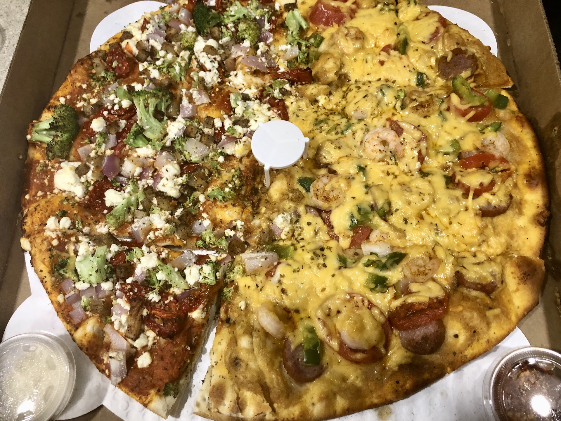 I had half creole and half Bombay garden. I think they would’ve both done well to have very little cheese, because it didn’t seem to go with the rest of the flavor situation. In fact, the creole could’ve had no cheese, and just amped up on a creamy étouffée sauce as a cheese substitute. As it was, I felt like the cheeses overwhelmed all the really interesting elements of both pizzas. In the future, please consider more masala sauce on the one pizza and more étouffée sauce on the second pizza, and a really light hand on the cheese. These are special ingredients, let’s not smother them with the cheese. When we are back in Indianapolis, we will certainly give them another try, and tell them either no cheese or light cheese, because the menu is really...