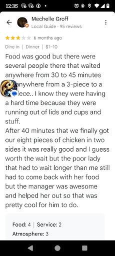 Read moreI ordered online at 6PM for a scheduled pickup at 6:30. I got to the restaurant and went inside at 6:22 to wait for my order as well as purchase a couple extra beverages. A man came into the restaurant and called the employees the âbâ word and asked for a water cup. An employee responded and said âwe donât have small cups anymoreâ. The man proceeded to dig through the trash to get a cup and left. I watched 6-7 more orders get taken out and the time was 6:57. I notice 2-3 other people who ordered at the counter get their food before me. I didnât get my 6:30 scheduled order until 7:05. I ordered a 6pc tender/12pc nugget family meal with mashed potatoes & gravy and sweet corn, as well as a 3pc (2 thigh, 1 drum) with mashed potatoes & gravy, and sweet corn. I received my whole order, but all was cold except the potatoes & gravy. Everyone was really kind, and they offered me a freebie, but I was so disheartened and anxious that I just wanted to leave. The building itself needs maintenance, because the sulfuric smell overwhelms the entire lobby to the point you canât even smell the food. Please understand this isnât a reflection of the employees themselves, theyâre really doing their best. The atmosphere wouldâve been so much better if this is brought to the right...