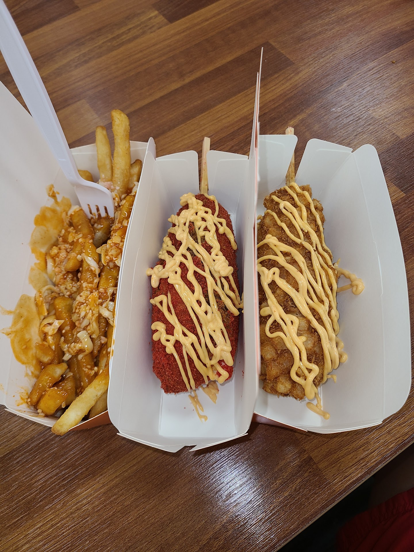 Read moreKorean style corn dogs are so good! This unique spot is located inside the Saraga international grocery store. As soon as you walk into the store there is a small "food court" located on the left. The seating area was a little dirty from multiple customers making messes at tables. The squeeze bottle condiments were communal and located on a tray on one of the tables. In the post covid Era, this seems a little questionable but that was honestly my only issue with this place. The corn dogs are so tasty. I also got the Buffalo garlic fries and they were super good. It's really low key and fun but it's location does this place a disservice for the atmosphere. There was also a sushi location and a Korean BBQ in the same food area. I will probably eat here every time I go to this grocery store for my...