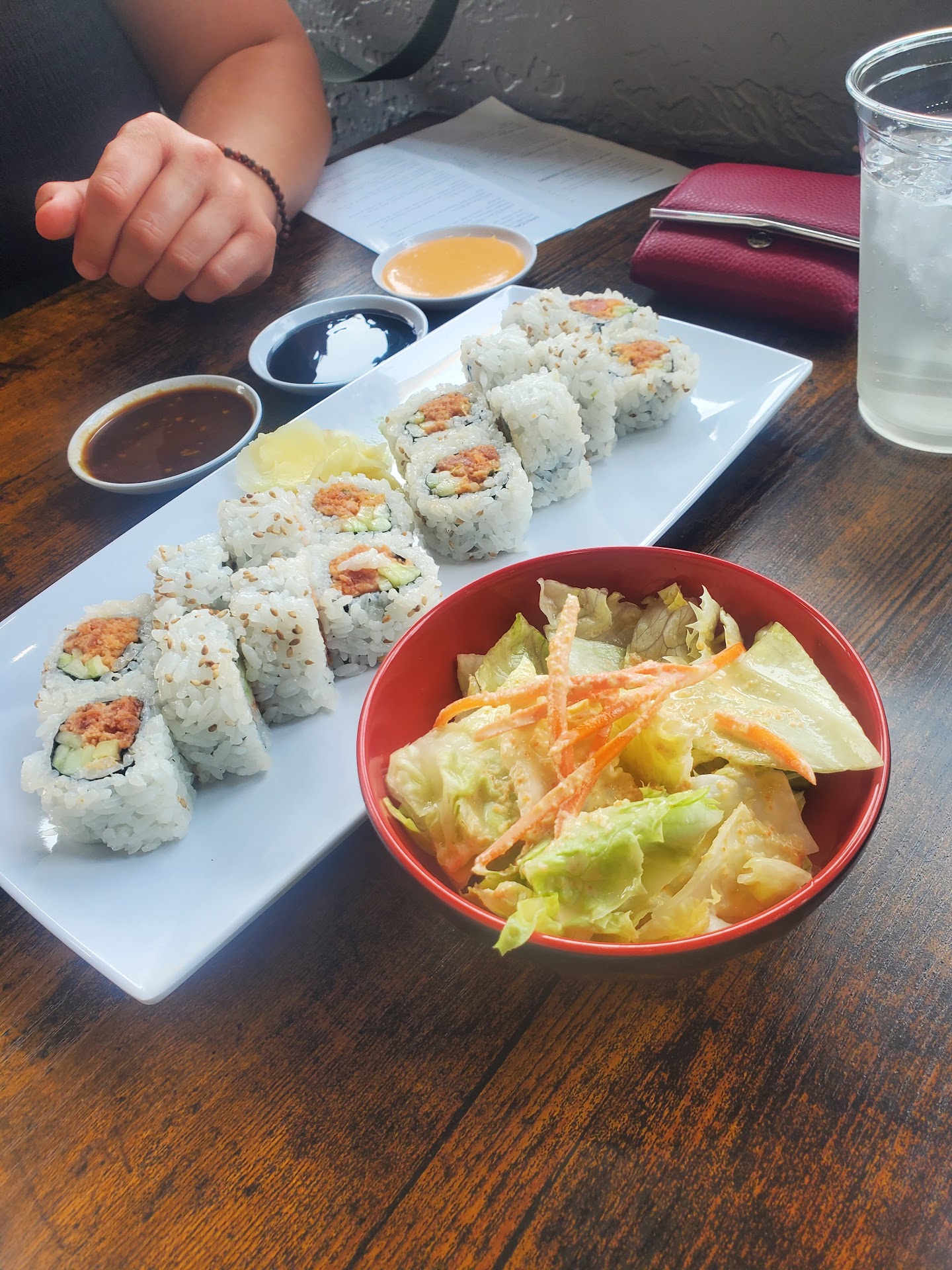 When I walked in on Monday at 7 there was only 1 couple dining. But several others were ordering takeout or door dash. The atmosphere was simple, but clean. There was a semi open kitchen and a sushi bar. I ordered an appetizer, wine and a hibachi meal. The flow seemed a bit rushed. My salad came first... very typical with a nice dressing. There were 8 pieces of Crab Rangoon with a sweet/sour dipping sauce. I ate all of them, but they didn't blow me away... mostly tasted of sweet cream cheese. Before I could finish my appetizer, the hibachi steak with vegetables and fried rice came out with yum yum sauce. I ordered medium rare. I was only given a fork and a napkin, but I could tell without cutting the steak that it was overcooked. I was chewing on the meat for longer than it should have taken. I opted to take home half of the entree and received a small box. I was delighted that for everything I got it was only $35. However, if it costed more I definitely wouldn't go back to try something else on a different night of the week. The other couple were raving about the sushi and said they would be back. The server recommended the ramen to them. Perhaps I will go back to try that...
