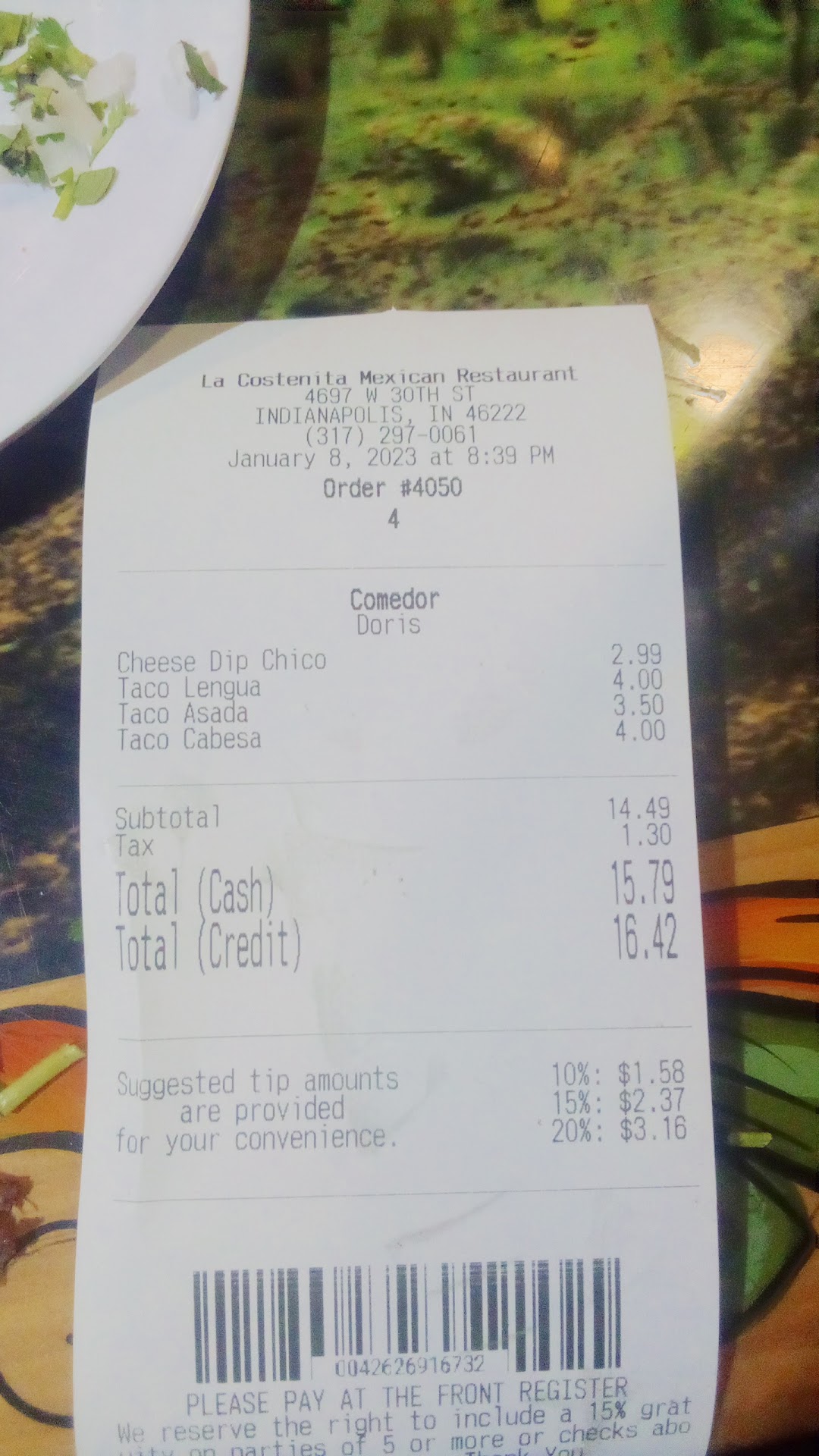 There are a hifh available dishes, including a variety of excellent tacos in the $3.50 to $4.00 range (eg, asada/steak, pollo/chicken, lengua/tongue, cabeza/cow-head, chorizo, fish, shrimp.)