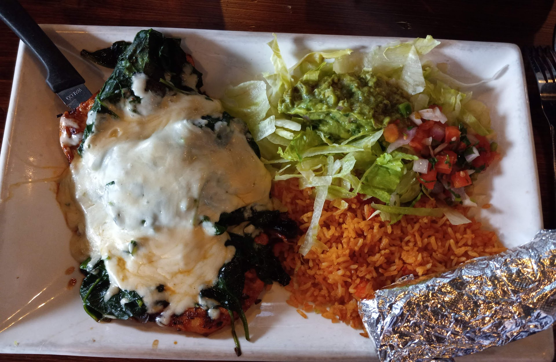 Food is very good. I loved the marinated chicken breast topped with spinach & mushrooms covered in melted cheese. I requested extra spinach and they was very generous. This came with sides of pico de gallo, guacamole, rice, and shredded lettuce. Everything was fresh and ripe. This may not be a traditional Mexican Cuisine menu item that first comes to mind but my objective this visit was vegetables. If this appeals to you order the "Pollo Sabroso" which translates to "tasty chicken".