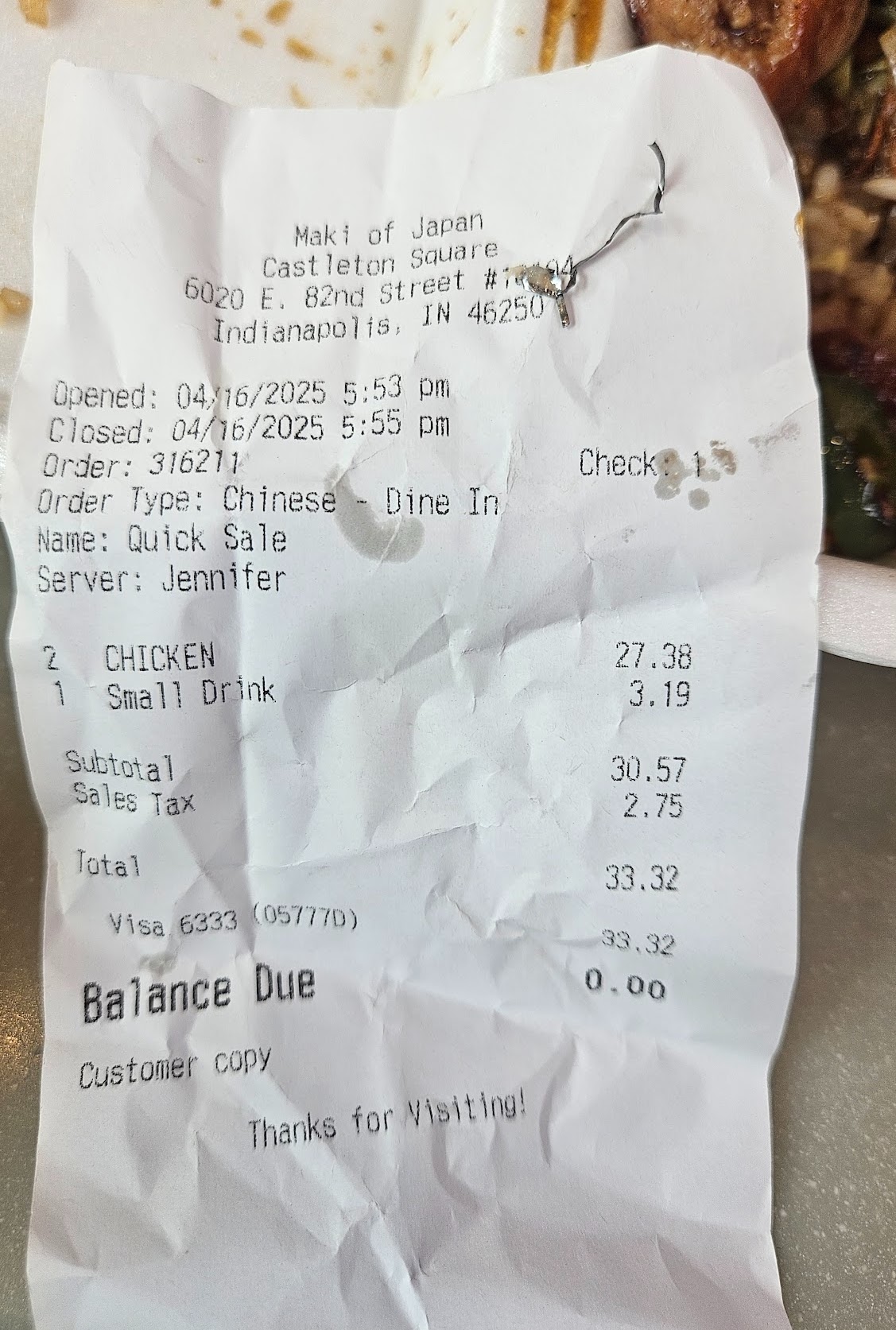 BEWARE. My wife almost swallowed a metal wire from her teriyaki chicken at Maki of Japan in Castleton Mall. We’ve been eating here for over 10 years because we love their sauce, even though service and food quality has gone down a lot lately. On April 16, 2025, we picked up our usual order. My wife and 3-year-old son were sharing theirs, and just a few bites in, she screamed and pulled out a metal wire from her mouth. If our son had gotten it instead, this could’ve been a medical emergency.