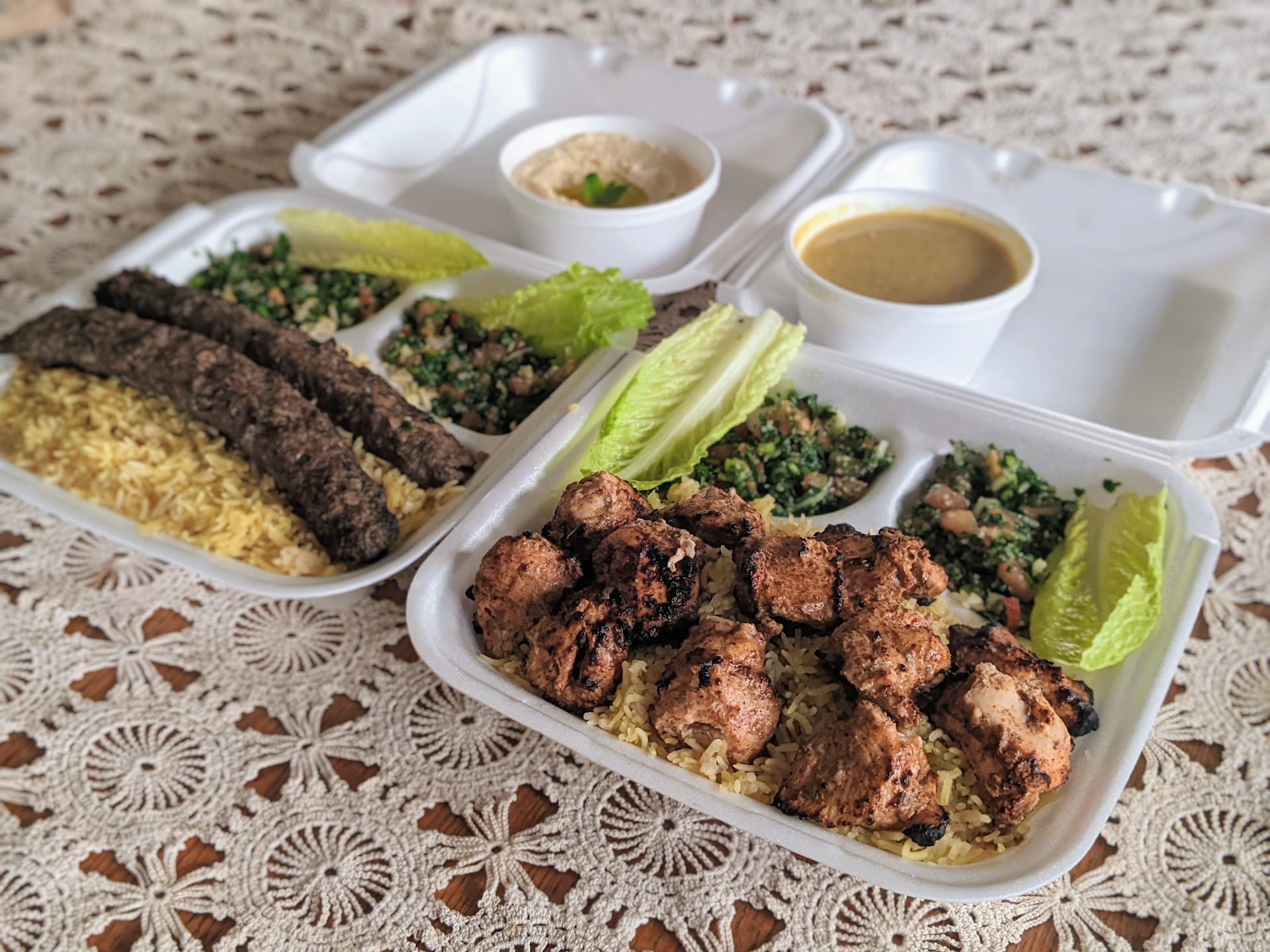 Don't hesitate to try--the food is amazing! It was our first time there and we asked the owners what to try. We ended up with beef kafta kabob and chicken sheesh tawook platters--both were packed with smoky flavors, moist NOT dry, and absolutely delicious! Platters come with rice, salad, hummus, and white/red/garlic sauces. We ended with homemade bakalava. Whole meal was 10/10.