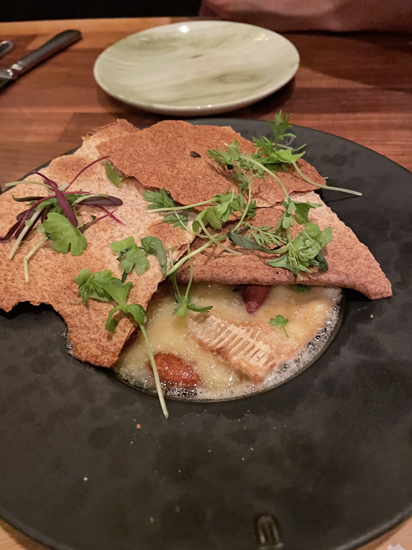 Read moreThis place, in my opinion, is a small, tiny step below that of a Michelin star restaurant. And they are certainly some of the best food you can get in Indy. I had just finished a huge exam and this was the place to asked to be taken in celebration. We arrived at 8:30 and, even though they close at 9, their service was not rushed at all. I ordered their Venetian Aperol spritz to start. It was very good but make sure to mix it up because it was quite strong at the bottom. For the starter we ordered the tulip tree trillium and the brisket dumplings. The cheese was so good but piping hot. I loved the texture of almonds in it along with the sweetness of the jam. The dumplings were also very good, the brisket inside was melt in your mouth good!