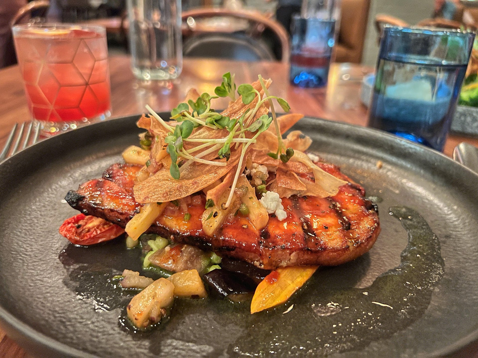 The food leans into elevated cuisine, aesthetically considered and notably palatable. It’s a sensory experience that aligns with visual allure and flavorful depth, each dish presented with an apparent respect for the ingredients and the diner. Our highlight was the pork chop - well rendered and tasty side vegetables. Complementing the meal, the cocktails, balanced and aptly crafted, not only paired well but stood impressively on their own.