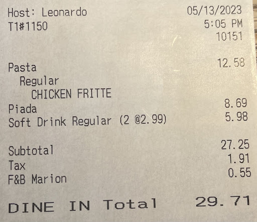 I ordered a BLT piada and added grilled chicken and black olives, but basically you can create your own and customize it any way you like. I also sampled my wife's pasta Carbonara with Italian sausage. Very tasty, and while I wouldn't compare this to a 4-5 star full-service Italian restaurant, this is fantastic for fast food. I really like places that allow you to customize, another reason for high marks here. Why not a perfect 5? I am a big fan of iced tea and although they have peach and lemon tea, their drinks are from a self-serve fountain and just average in my opinion. However, they also have a couple "Italian Sodas" and a gallon of blackberry hibiscus lemonade which brings some variety and depth to otherwise standard Pepsi offering. Since this is a regional place (mostly in the Midwest) many of you will only have the opportunity to visit one when traveling... I say it's worth going out of your way...